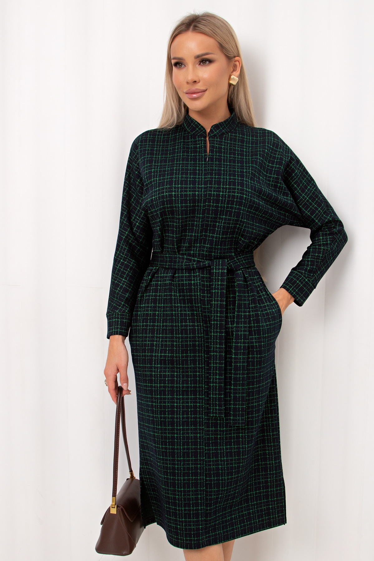 Лаконичное платье прямого силуэта выполнено из трикотажного полотна. Длинный цельнокроеный рукав летучая мышь, оканчивается притачной манжетой. Горловина оформлена воротником - стойка. По переду застежка на потайную молнию. По боковым швам расположены функциональные карманы. Низ ровный, по бокам разрезы. Пояс из основного материала в комплекте.