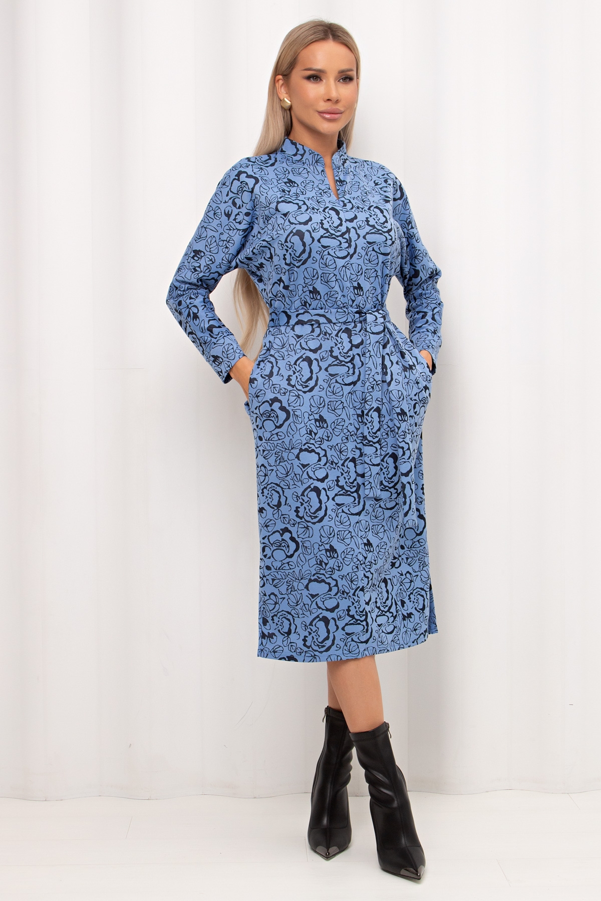Лаконичное платье прямого силуэта выполнено из трикотажного полотна. Длинный цельнокроеный рукав летучая мышь, оканчивается притачной манжетой. Горловина оформлена воротником - стойка. По переду застежка на потайную молнию. По боковым швам расположены функциональные карманы. Низ ровный, по бокам разрезы. Пояс из основного материала в комплекте.
