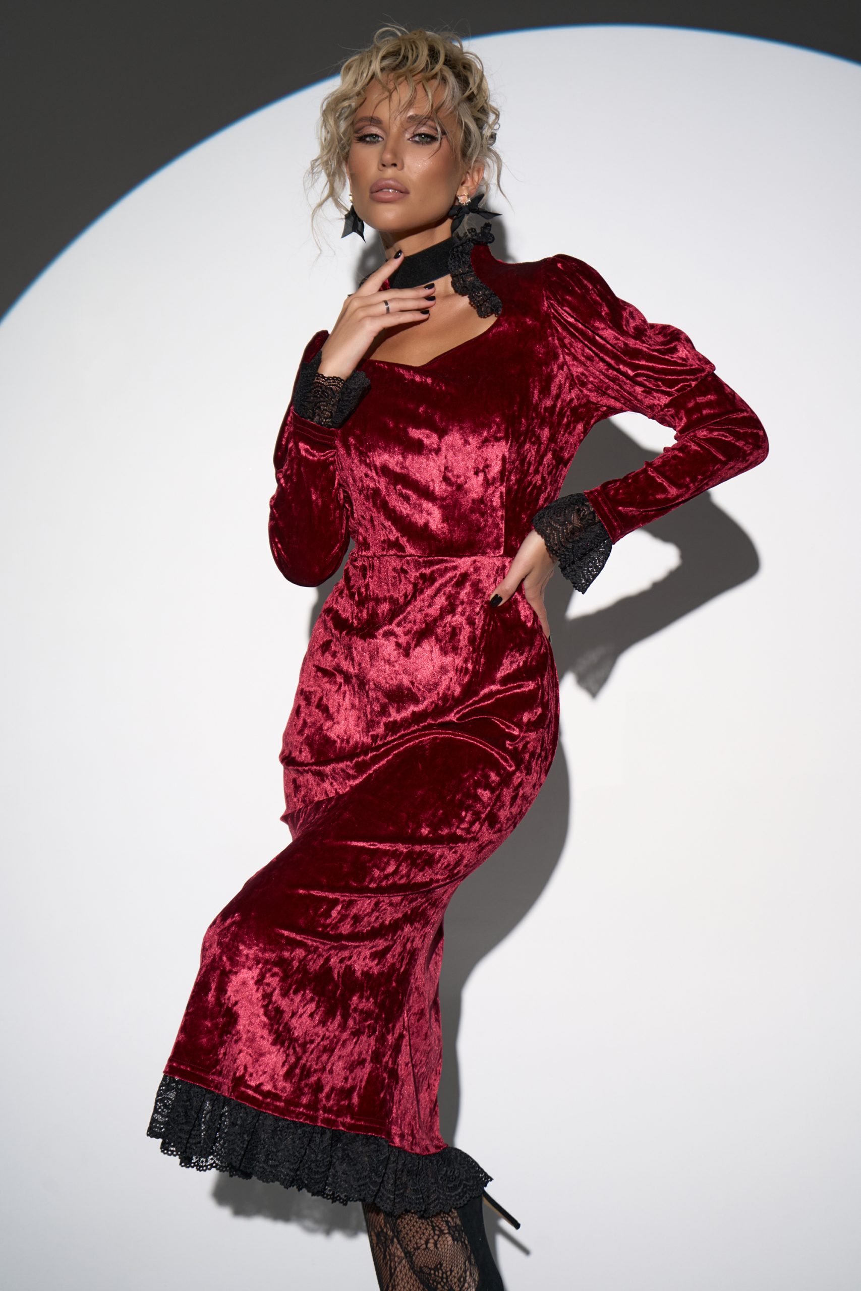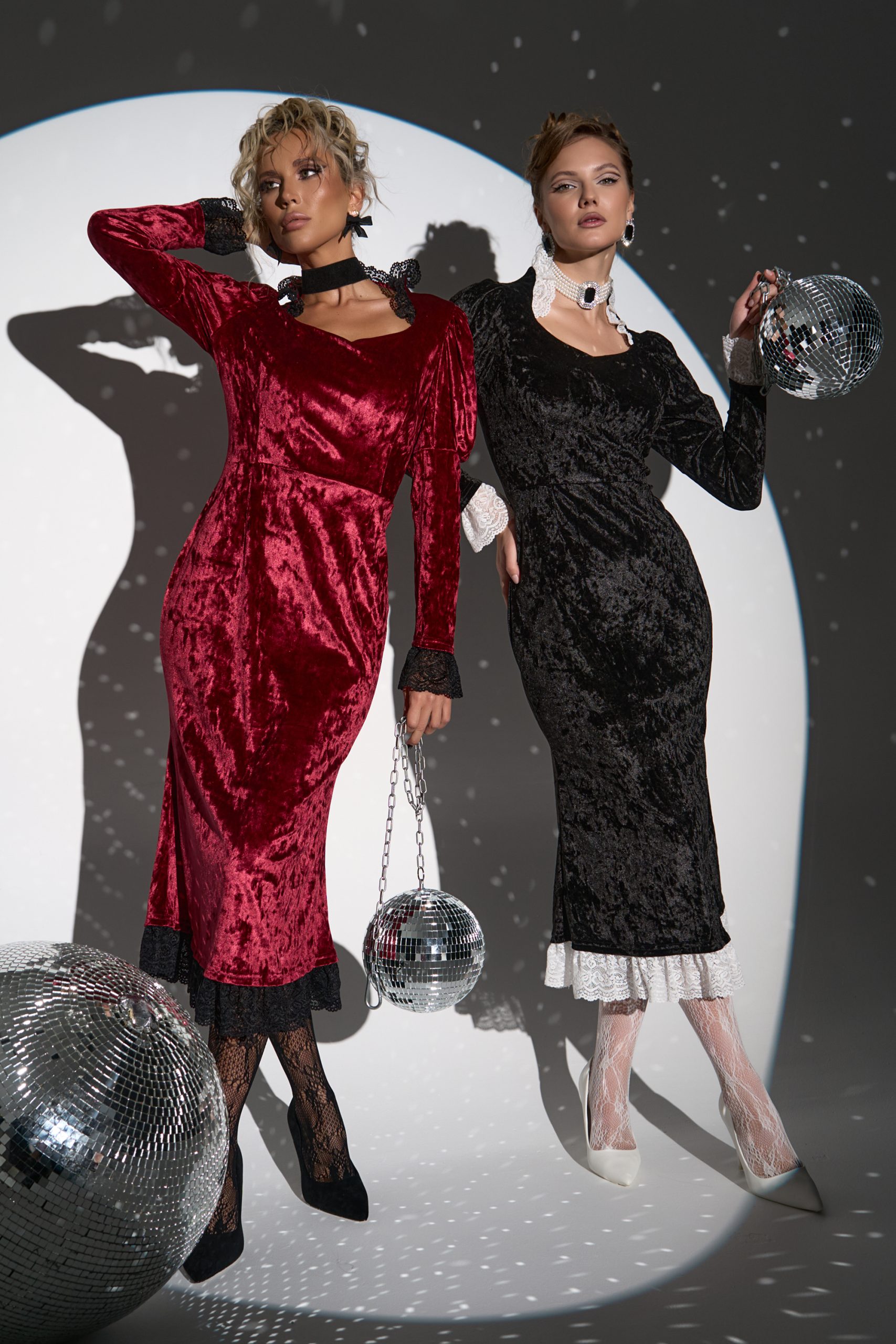 Бархатное платье— воплощение элегантности и утончённости. Мягкая, роскошная текстура бархата нежно обнимает силуэт, подчеркивая каждый изгиб и создавая эффект безупречной грации. Кружевные вставки изящно обрамляют фигурный вырез, добавляя романтический шарм.