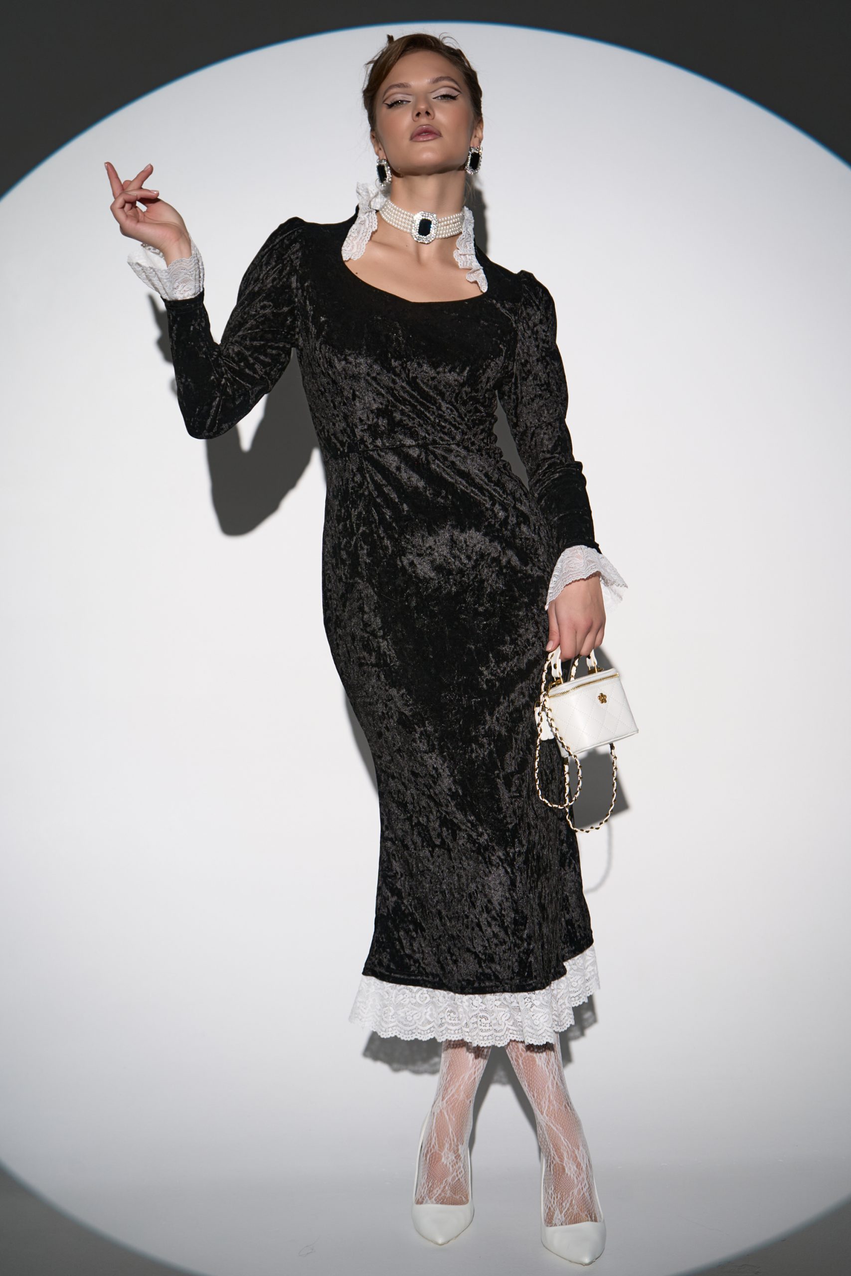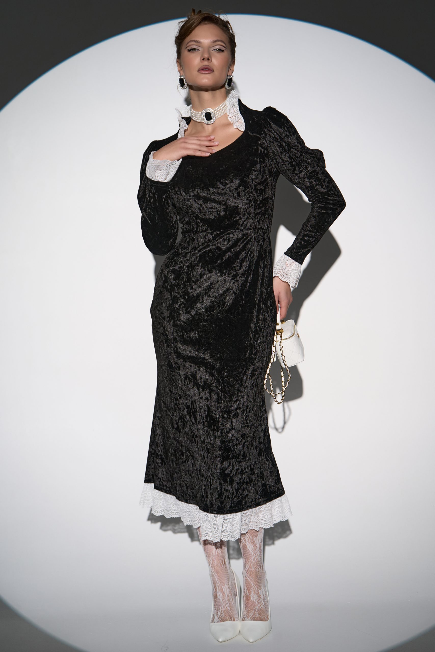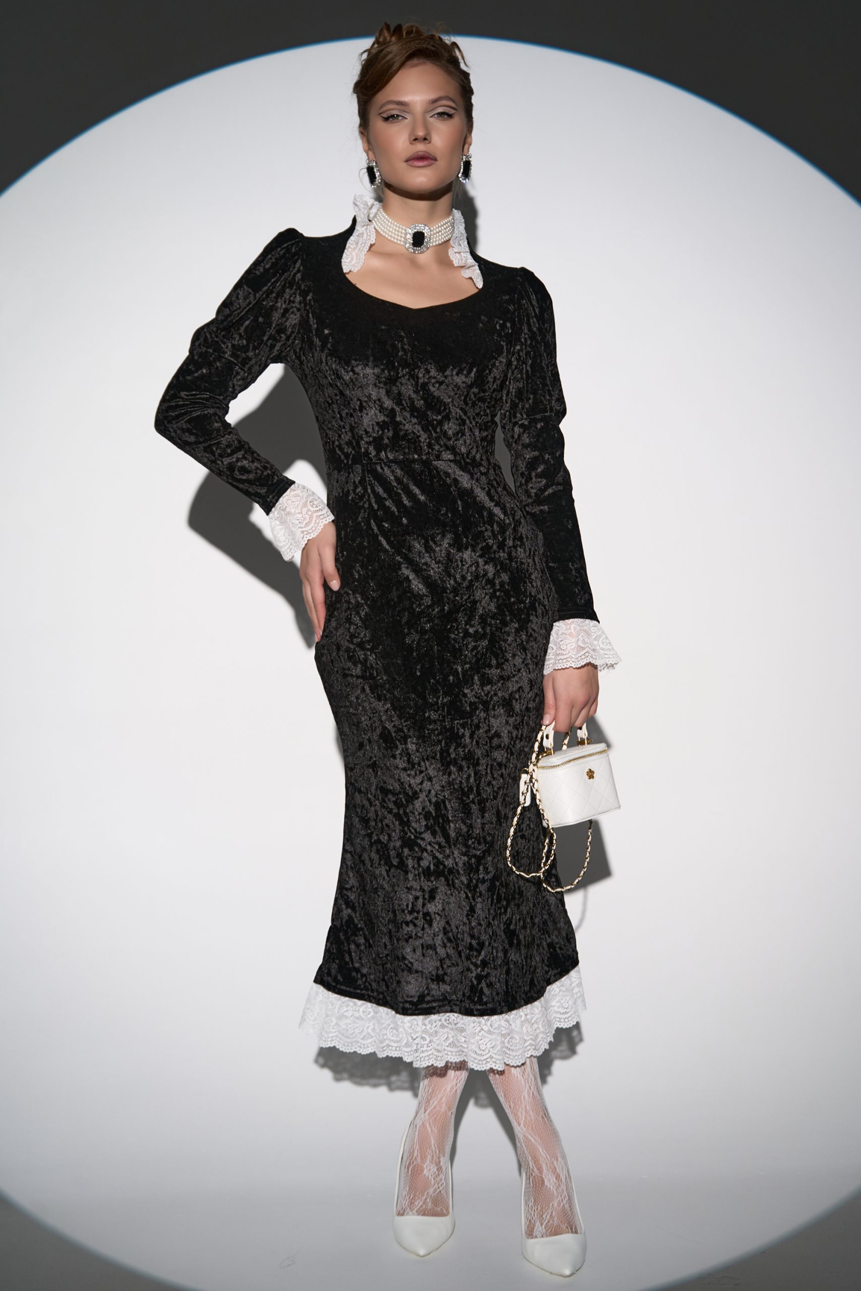 Бархатное платье— воплощение элегантности и утончённости. Мягкая, роскошная текстура бархата нежно обнимает силуэт, подчеркивая каждый изгиб и создавая эффект безупречной грации. Кружевные вставки изящно обрамляют фигурный вырез, добавляя романтический шарм.