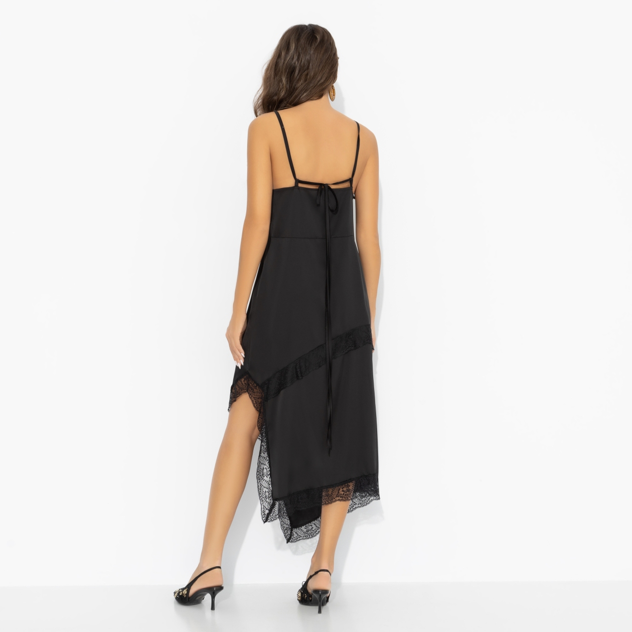 Эпоха дерзких 90‑х, клубы до утра и глянцевые журналы с Кейт Мосс на обложке... Это платье будто из тех колоритных времён: тонкие бретели, кружевной вырез и расслабленная уверенность девушки, которая приходит на вечеринку последней и всё равно становится магнитом для взглядов. Чёрное платье с асимметричным подолом создаёт эффект невесомости и подчёркивает длину ног. Идеально для тех, кто любит минимализм с характером и хочет добавить в образ немного культовой эстетики 90‑х. Носите с грубыми ботинками и свитером кроя оверсайз или элегантными лодочками и жакетом мужского кроя.
