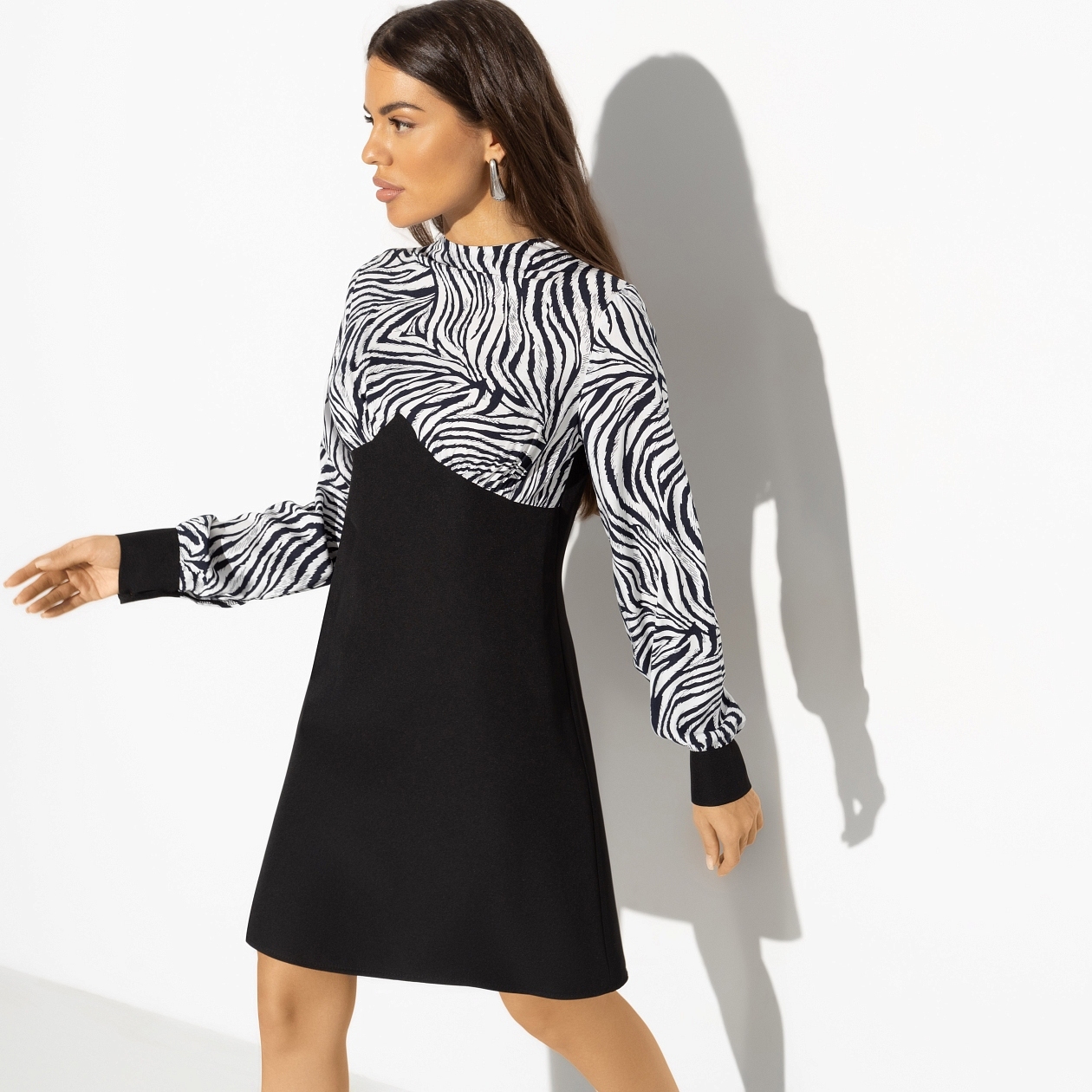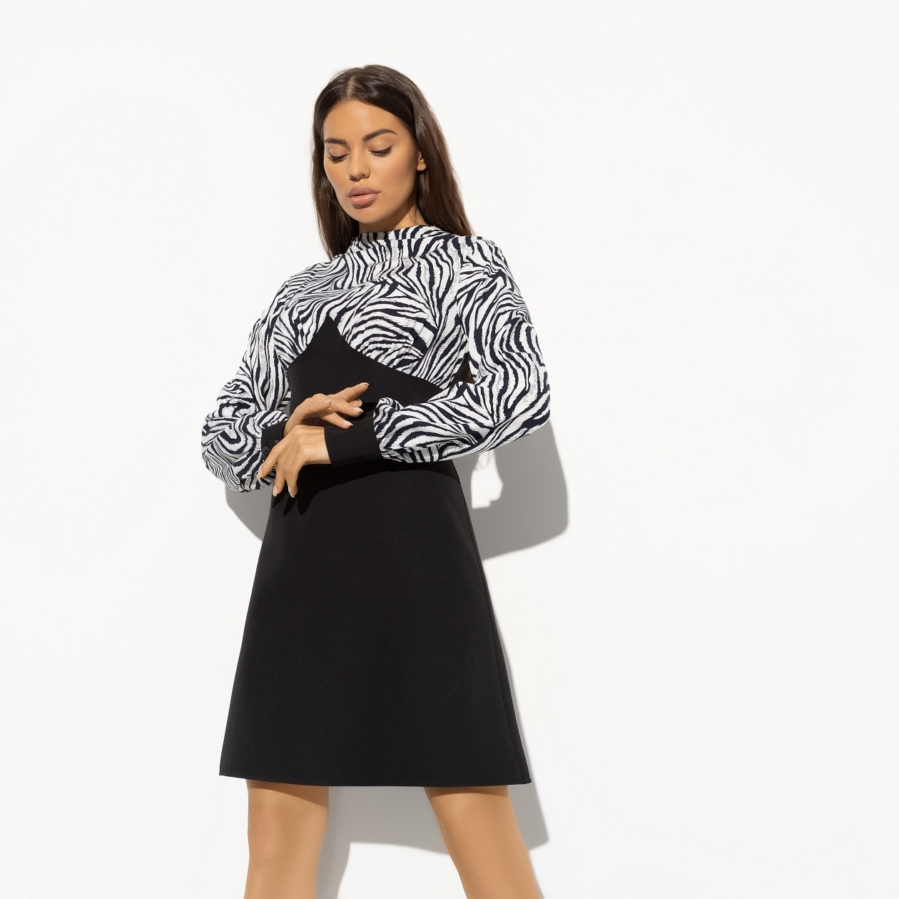 Быть особенной – выбирать зебру. Нетривиальный анималистичный принт бьет все рекорды – Isabel Marant, Bottega Veneta, Saint Laurant представили на подиуме изделия в черно-белом диком принте. Если вы не готовы пока облачаться в него с ног до головы, выбирайте платье с модными акцентными вставками. Платье в длине миди. Приталенный а-силуэт. Сочетание двух видов ткани, акцентный материал вшит. Платье застегивается на скрытую молнию по спинке.