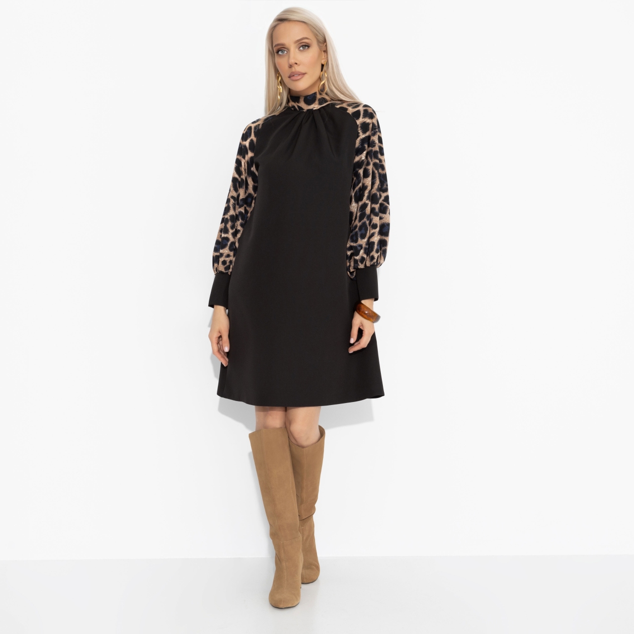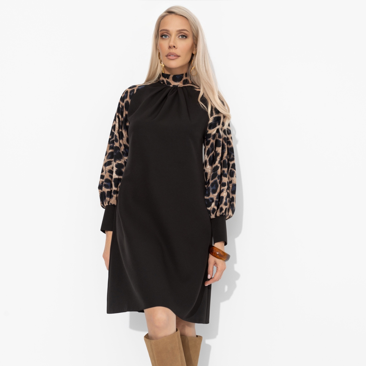 Платье ЧАРУТТИ было её доспехами – чёрная основа, строгая и серьёзная, и дикий леопардовый принт на рукавах, как символ побед. В платье она шла на переговоры, зная, что чёрный цвет внушает уважение, а животный принт предупреждает: с ней шутки плохи. Это история ЧАРУТТИ о том, как роскошь и воля создают уникальный образ. Платье трапециевидного силуэта в длине до колена. Рукава акцентного материала с трендовым принтом. Платье хорошо смотрится на любом типе фигуры. Воротник-стойка сзади оформлен бантом.