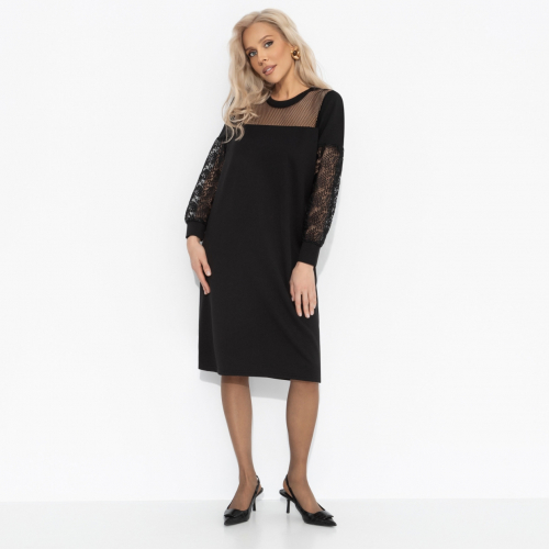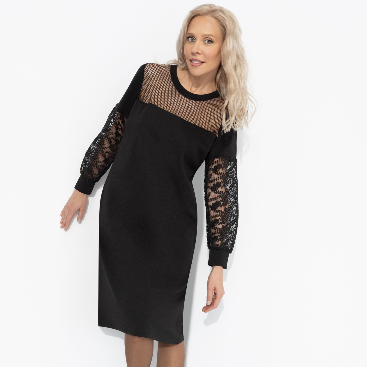 Она отключила телефон. Оставила суету за дверью. Платье из ткани «Диор» с кружевными рукавами мягко ложится по силуэту – и кажется, будто делает ее еще красивее. В отражении зеркала – спокойствие, вкус к жизни и лёгкая интрига. Платье прямого силуэта длины миди с мягкой посадкой по фигуре. Полупрозрачная вставка из сетки и рукава из гипюра-стрейч создают изящный контраст фактур.