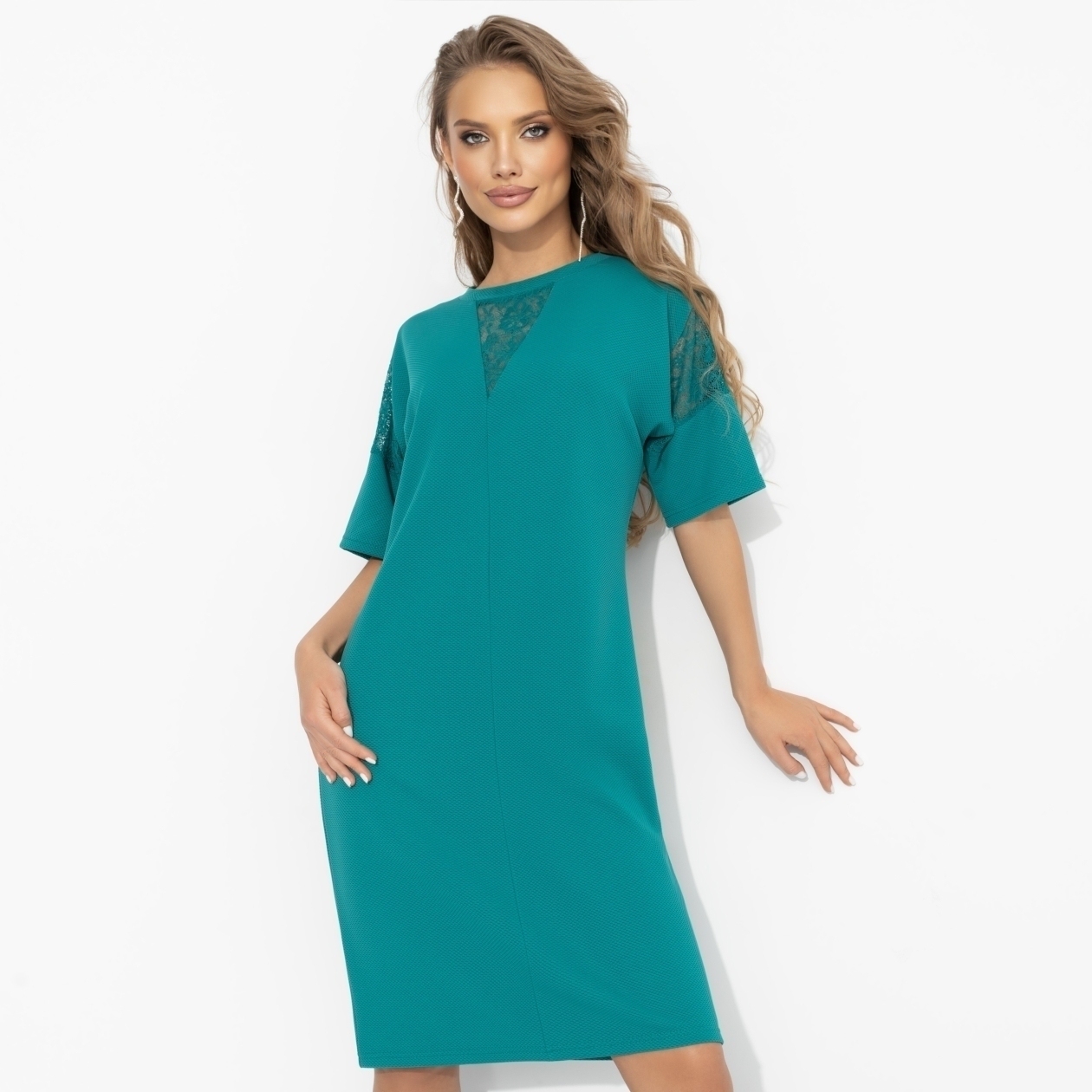 Яркий бирюзовый – цвет для тех, кто не боится быть главным акцентом в комнате и выбирает моду как язык самовыражения. Спокойный, но насыщенный оттенок зелёного ассоциируется с внутренней уверенностью и гармонией, поэтому в таком платье легко заявить о себе: «да, это я, и я собой горжусь». Трикотажное платье прямого силуэта мягко облегает фигуру. Вставки из эластичного «гипюра‑стрейч» на рукавах и в зоне декольте создают лёгкий эффект полупрозрачности, добавляют образу загадочности и подчёркивают смелый характер.
