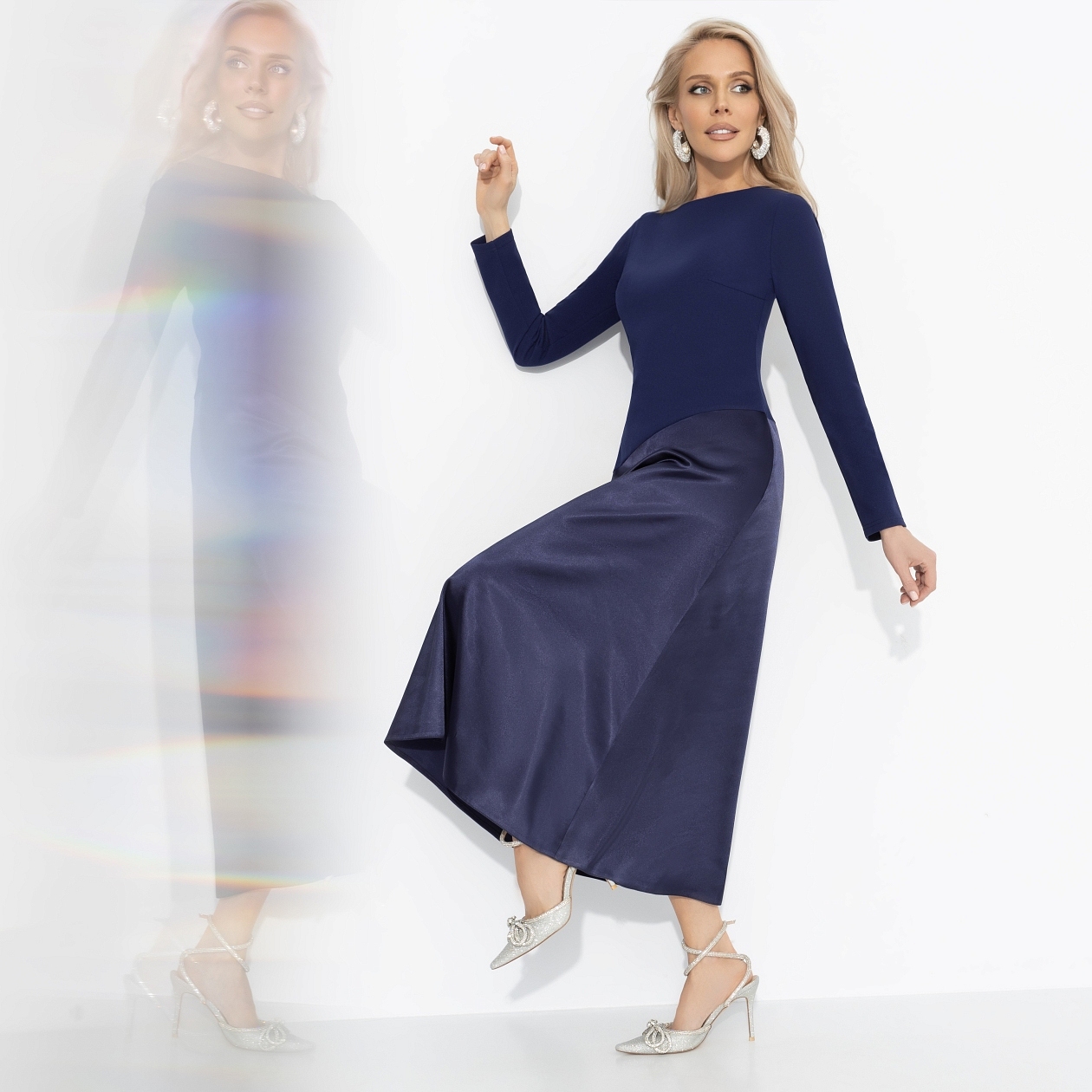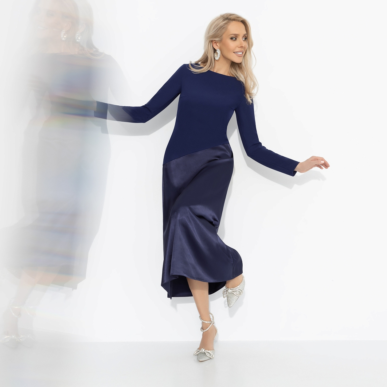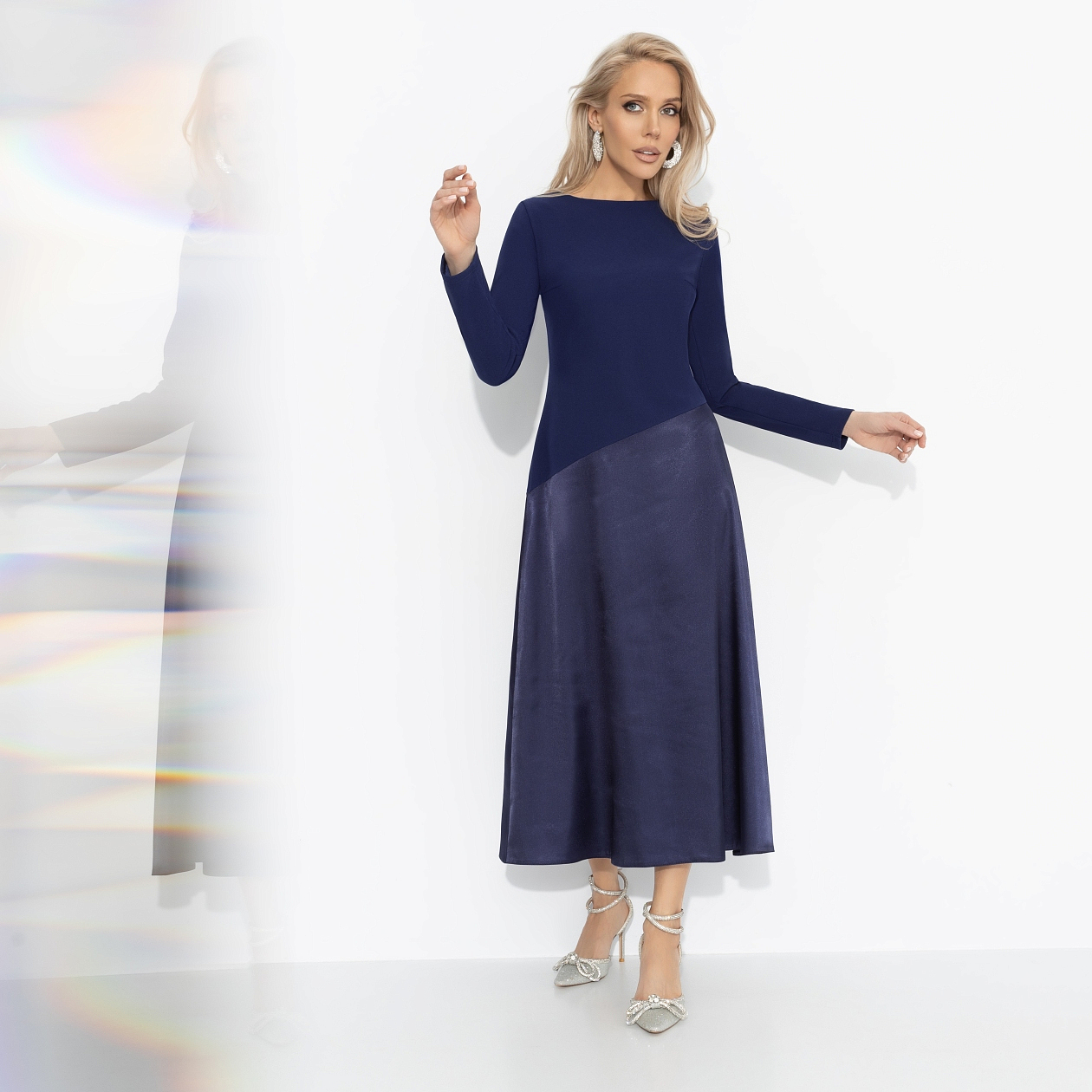 Бархатное небо Петербурга озаряют фейерверки, а каждый миг кажется волшебным. Глубокий синий цвет твоего нового платья идеально отражает атмосферу праздничных огней, ожидания новых встреч и исполнения желаний. Асимметричная линия, сияние ткани, идеальная длина для комбинации с любой верхней одеждой. В таком образе хочется не спать до рассвета и загадывать самые смелые мечты.