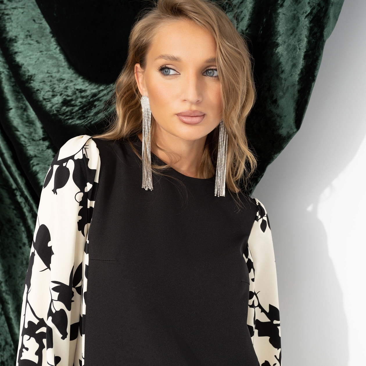 Быть знаменитостью – значит просто быть собой. Шёлк скользит по коже, даря ощущение уверенности. Контраст чёрного и белого создаёт кадр, в котором ты и есть – главный акцент. Платье прямого кроя с разрезом по спинке. Подол асимметричный. Застежка на пуговицу.