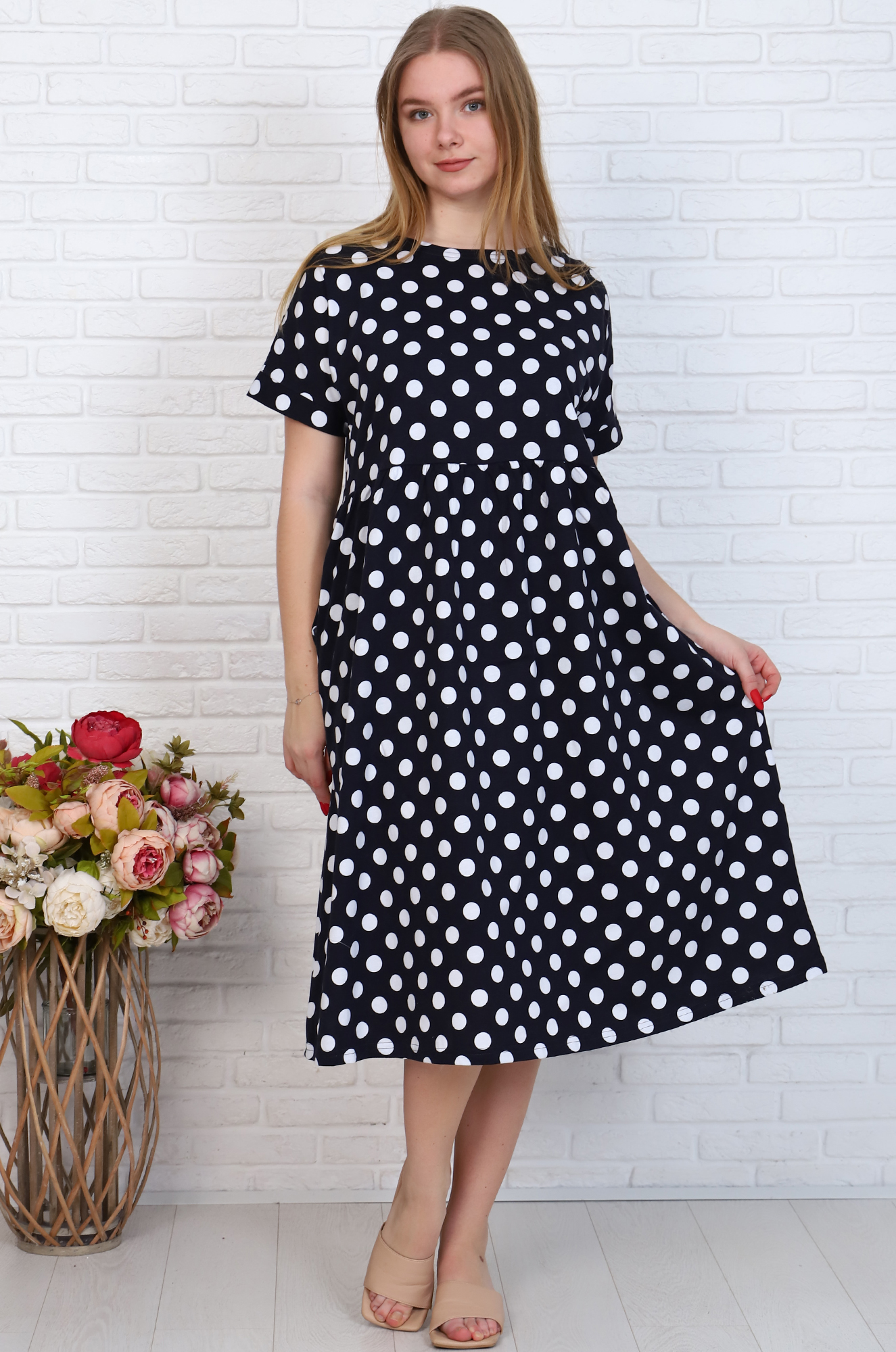 Хлопковое женское платье комфортной длины миди. Модель свободного кроя, с отрезной талией, рукав цельнокроенный, в боковых швах карманы. Пышная юбка придаёт лёгкости, романтики и женственности.
