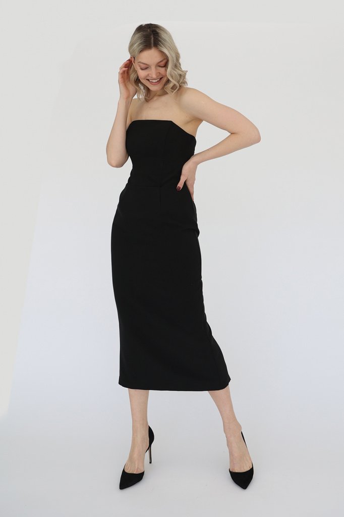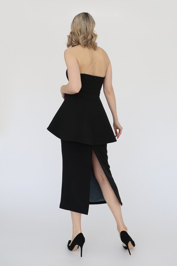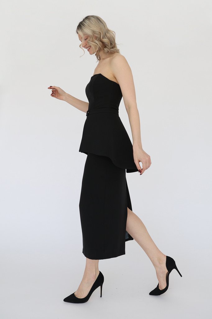 Вечернее платье корсетного типа со съемной баской. Юбка платья на подкладке с высоким разрезом сзади