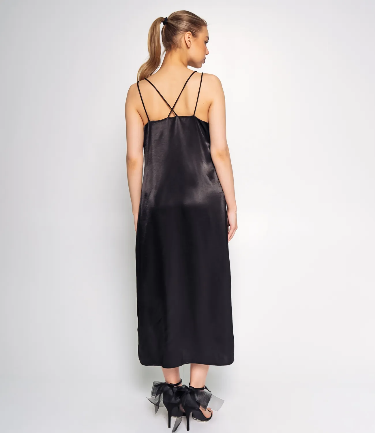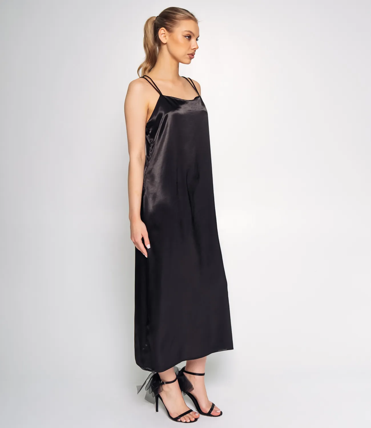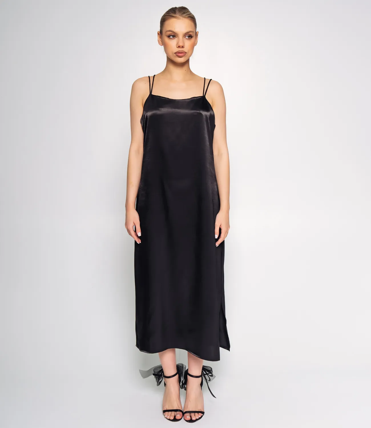 Элегантное платье, выполненное из 100% полиэстера с атласным эффектом, что придаёт изделию гладкую, блестящую поверхность и лёгкий перелив ткани при движении. Платье имеет прямой силуэт, который свободно ниспадает по фигуре, подчеркивая утонченность и элегантность образа. Длина платья достигает примерно середины икр, что создаёт баланс между изяществом и практичностью. Особенностью модели являются тонкие двойные бретели, которые аккуратно располагаются на плечах, придавая лёгкость и воздушность образу. Линия выреза — прямоугольная по переду, без дополнительных украшений или драпировок, что усиливает минималистичный и современный стиль. Платье не имеет застёжек, карманов или других декоративных элементов, вся его привлекательность сосредоточена в простом, классическом крое и блеске ткани. Такое платье идеально подойдёт для вечерних мероприятий, торжеств или других случаев, когда требуется изысканный и стильный наряд. Рост 168 см, 89-63-90.