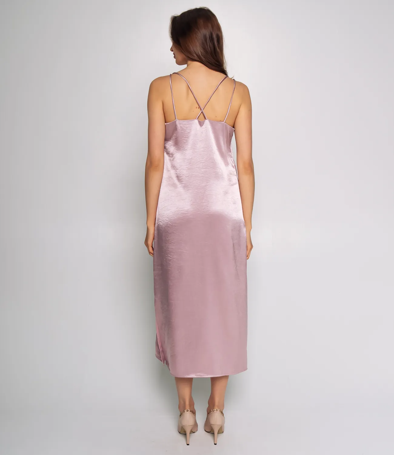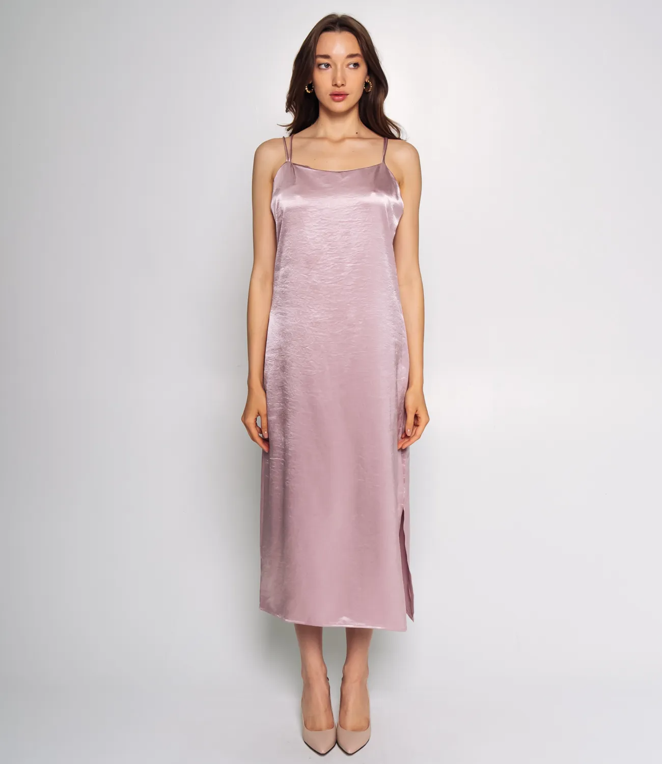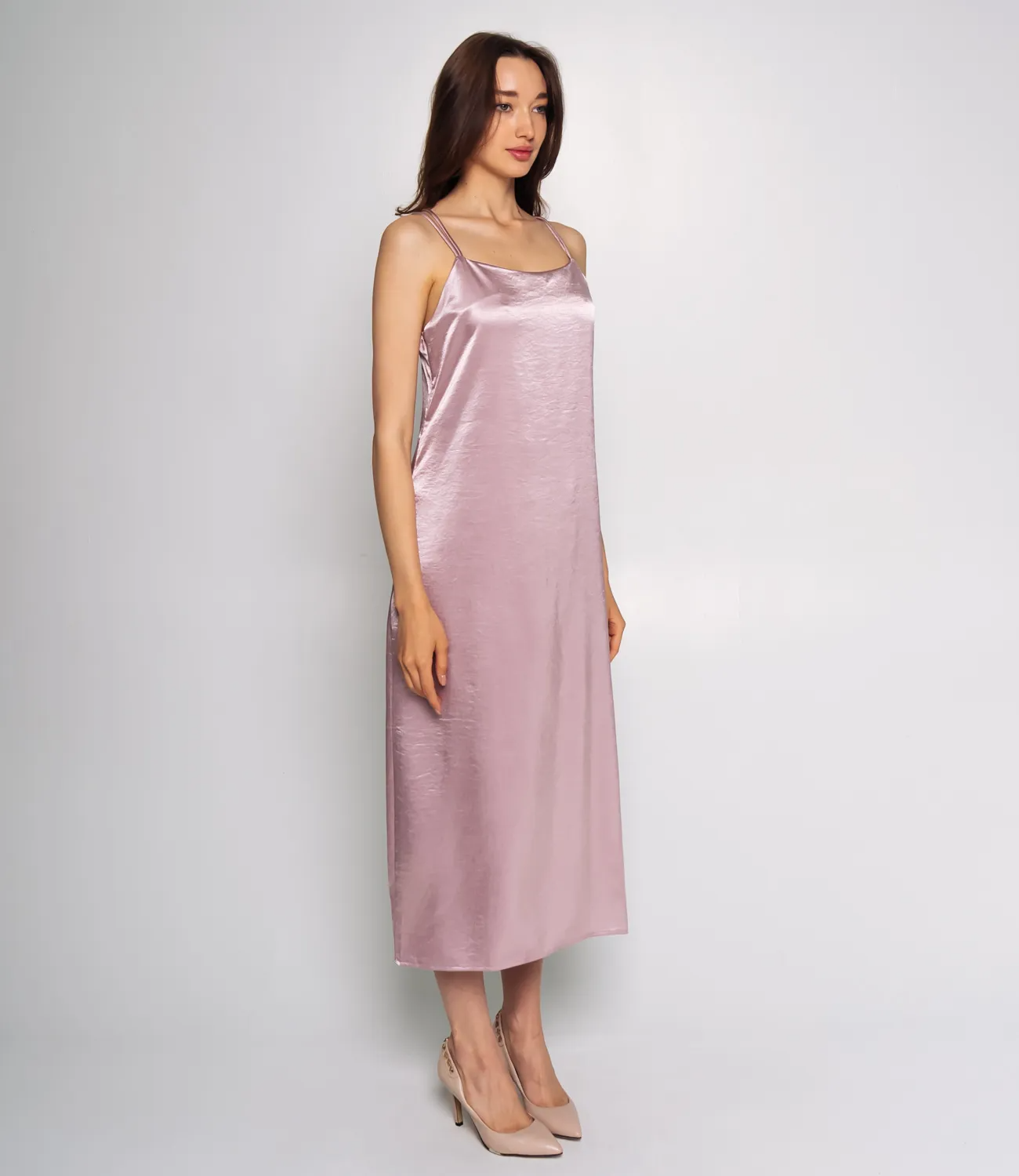 Элегантное платье, выполненное из 100% полиэстера с атласным эффектом, что придаёт изделию гладкую, блестящую поверхность и лёгкий перелив ткани при движении. Платье имеет прямой силуэт, который свободно ниспадает по фигуре, подчеркивая утонченность и элегантность образа. Длина платья достигает примерно середины икр, что создаёт баланс между изяществом и практичностью. Особенностью модели являются тонкие двойные бретели, которые аккуратно располагаются на плечах, придавая лёгкость и воздушность образу. Линия выреза — прямоугольная по переду, без дополнительных украшений или драпировок, что усиливает минималистичный и современный стиль. Платье не имеет застёжек, карманов или других декоративных элементов, вся его привлекательность сосредоточена в простом, классическом крое и блеске ткани. Такое платье идеально подойдёт для вечерних мероприятий, торжеств или других случаев, когда требуется изысканный и стильный наряд. Рост 168, 85-63-92.