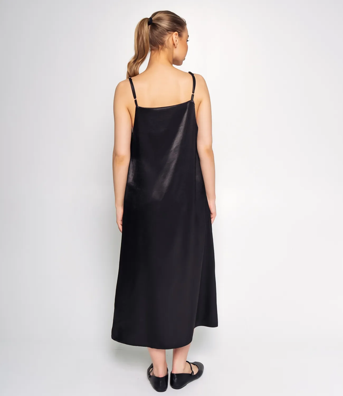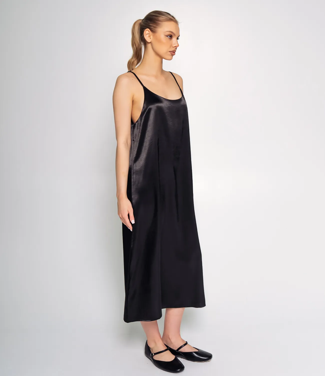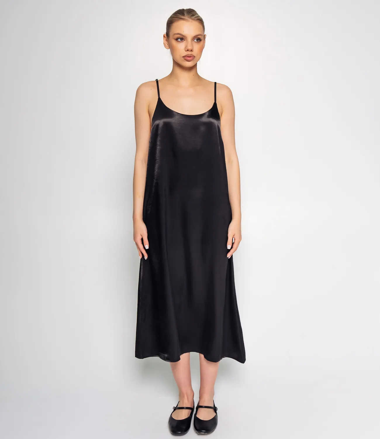 Элегантное платье, выполненное из 100% полиэстера с атласным эффектом, что придаёт изделию гладкую, блестящую поверхность и лёгкий перелив ткани при движении. Платье имеет прямой силуэт, который свободно ниспадает по фигуре, подчеркивая утонченность и элегантность образа. Длина платья достигает примерно середины икр, что создаёт баланс между изяществом и практичностью. Особенностью модели являются тонкие бретели, которые аккуратно располагаются на плечах, придавая лёгкость и воздушность образу. Линия выреза — округлая, без дополнительных украшений или драпировок, что усиливает минималистичный и современный стиль. Платье не имеет застёжек, карманов или других декоративных элементов, вся его привлекательность сосредоточена в простом, классическом крое и блеске ткани. Такое платье идеально подойдёт для вечерних мероприятий, торжеств или других случаев, когда требуется изысканный и стильный наряд. Рост 168 см, 89-63-90.