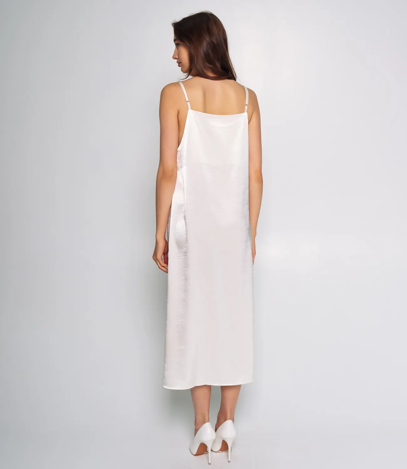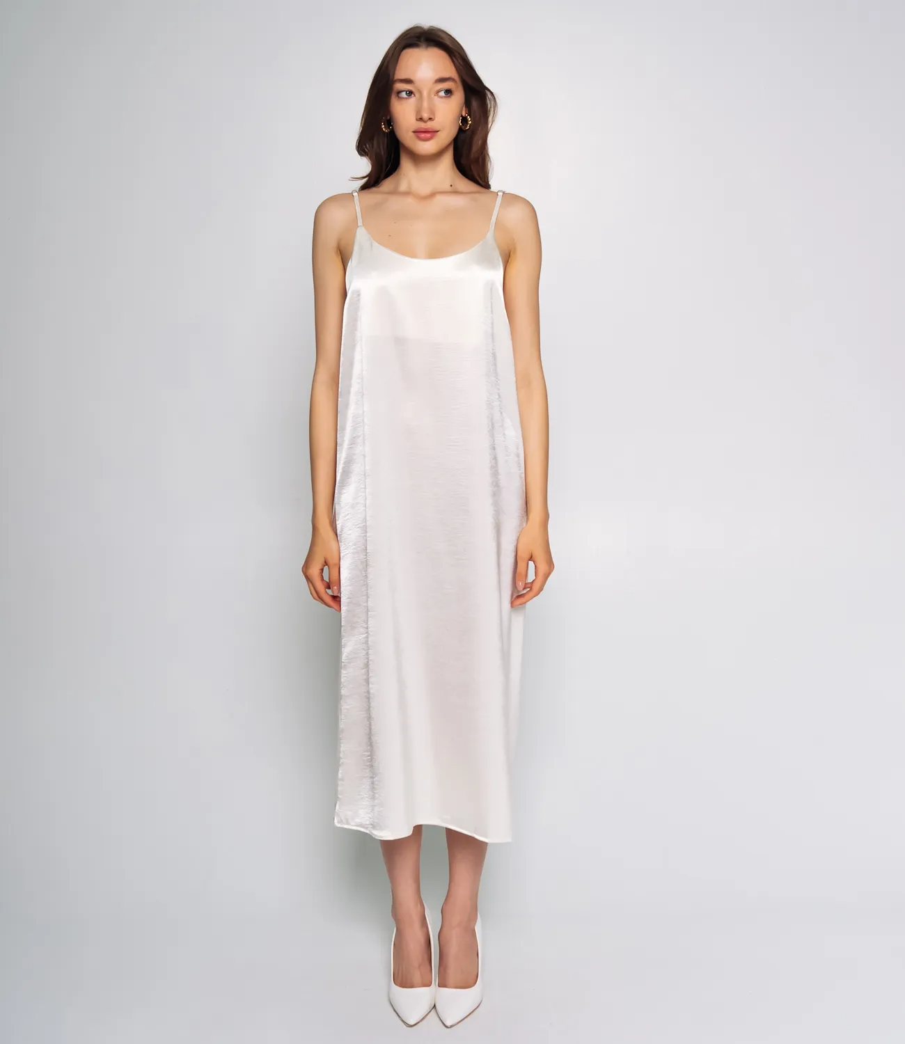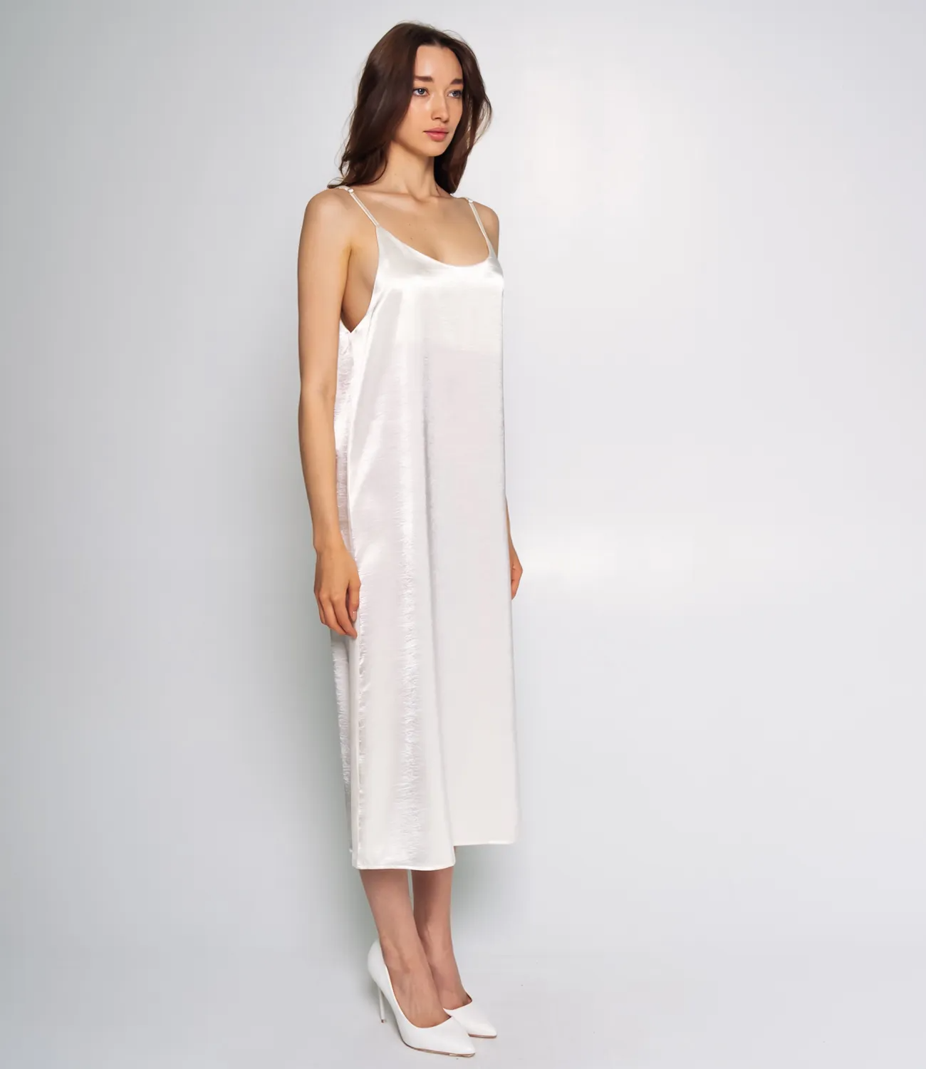 Элегантное платье, выполненное из 100% полиэстера с атласным эффектом, что придаёт изделию гладкую, блестящую поверхность и лёгкий перелив ткани при движении. Платье имеет прямой силуэт, который свободно ниспадает по фигуре, подчеркивая утонченность и элегантность образа. Длина платья достигает примерно середины икр, что создаёт баланс между изяществом и практичностью. Особенностью модели являются тонкие бретели, которые аккуратно располагаются на плечах, придавая лёгкость и воздушность образу. Линия выреза — округлая, без дополнительных украшений или драпировок, что усиливает минималистичный и современный стиль. Платье не имеет застёжек, карманов или других декоративных элементов, вся его привлекательность сосредоточена в простом, классическом крое и блеске ткани. Такое платье идеально подойдёт для вечерних мероприятий, торжеств или других случаев, когда требуется изысканный и стильный наряд. Рост 168, 85-63-92.