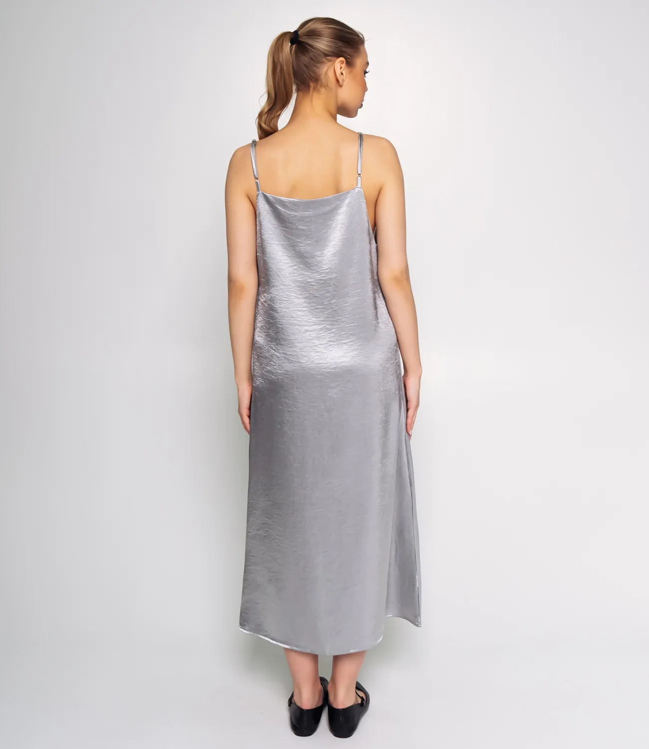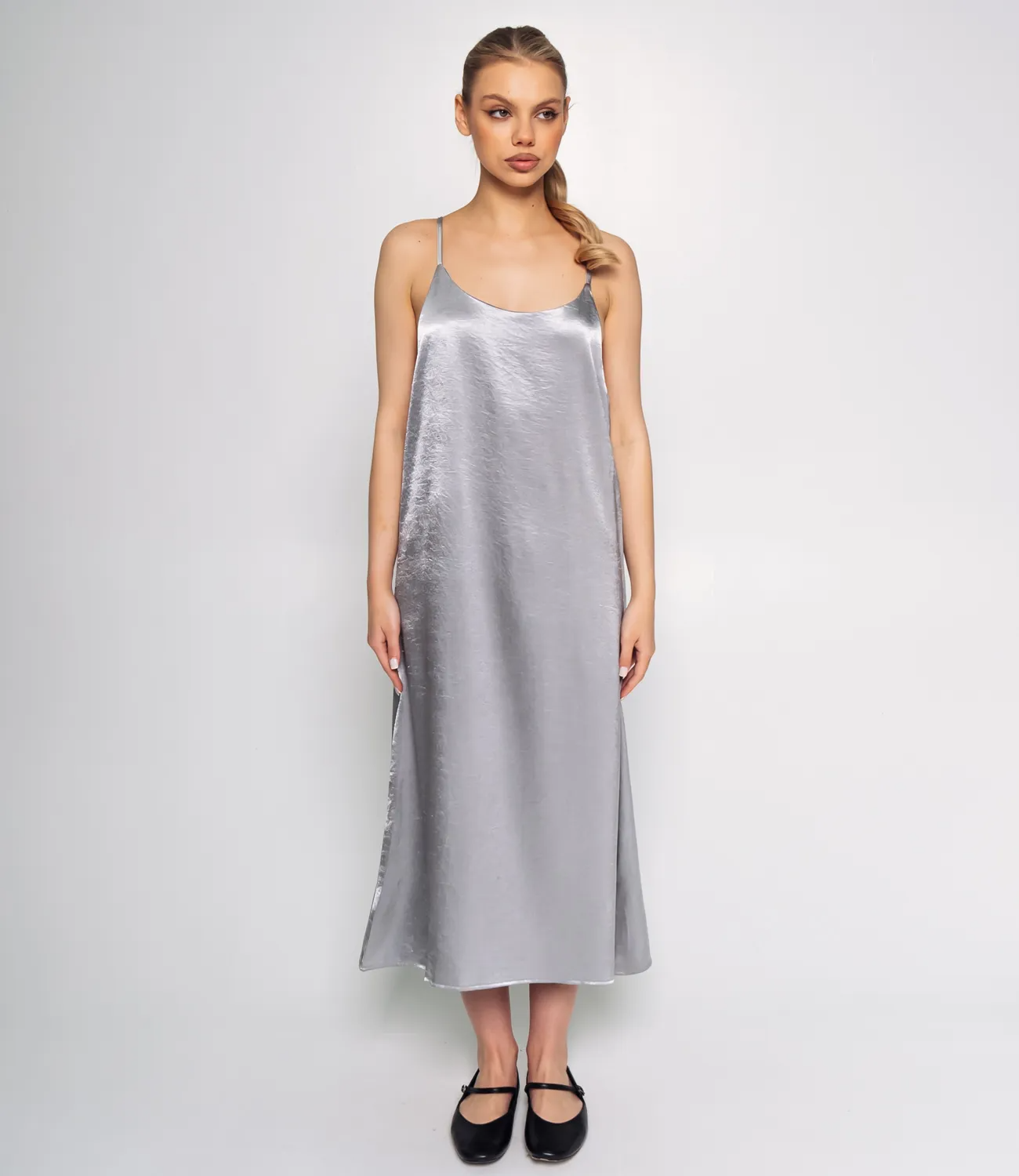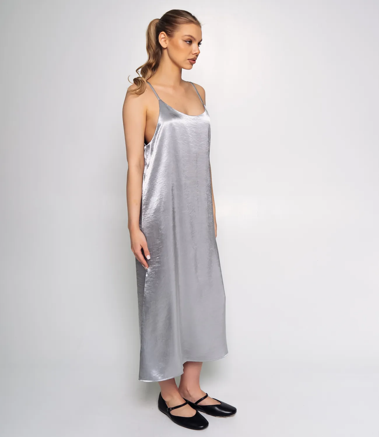 Элегантное платье, выполненное из 100% полиэстера с атласным эффектом, что придаёт изделию гладкую, блестящую поверхность и лёгкий перелив ткани при движении. Платье имеет прямой силуэт, который свободно ниспадает по фигуре, подчеркивая утонченность и элегантность образа. Длина платья достигает примерно середины икр, что создаёт баланс между изяществом и практичностью. Особенностью модели являются тонкие бретели, которые аккуратно располагаются на плечах, придавая лёгкость и воздушность образу. Линия выреза — округлая, без дополнительных украшений или драпировок, что усиливает минималистичный и современный стиль. Платье не имеет застёжек, карманов или других декоративных элементов, вся его привлекательность сосредоточена в простом, классическом крое и блеске ткани. Такое платье идеально подойдёт для вечерних мероприятий, торжеств или других случаев, когда требуется изысканный и стильный наряд. Рост 168 см, 89-63-90.