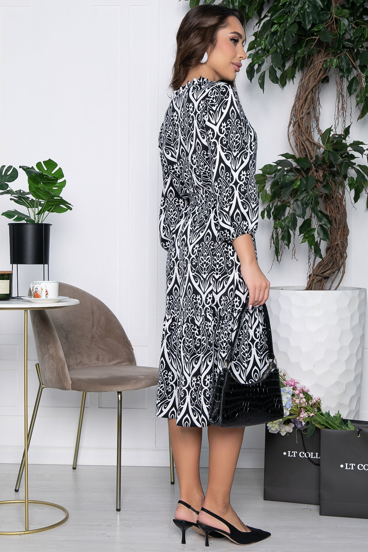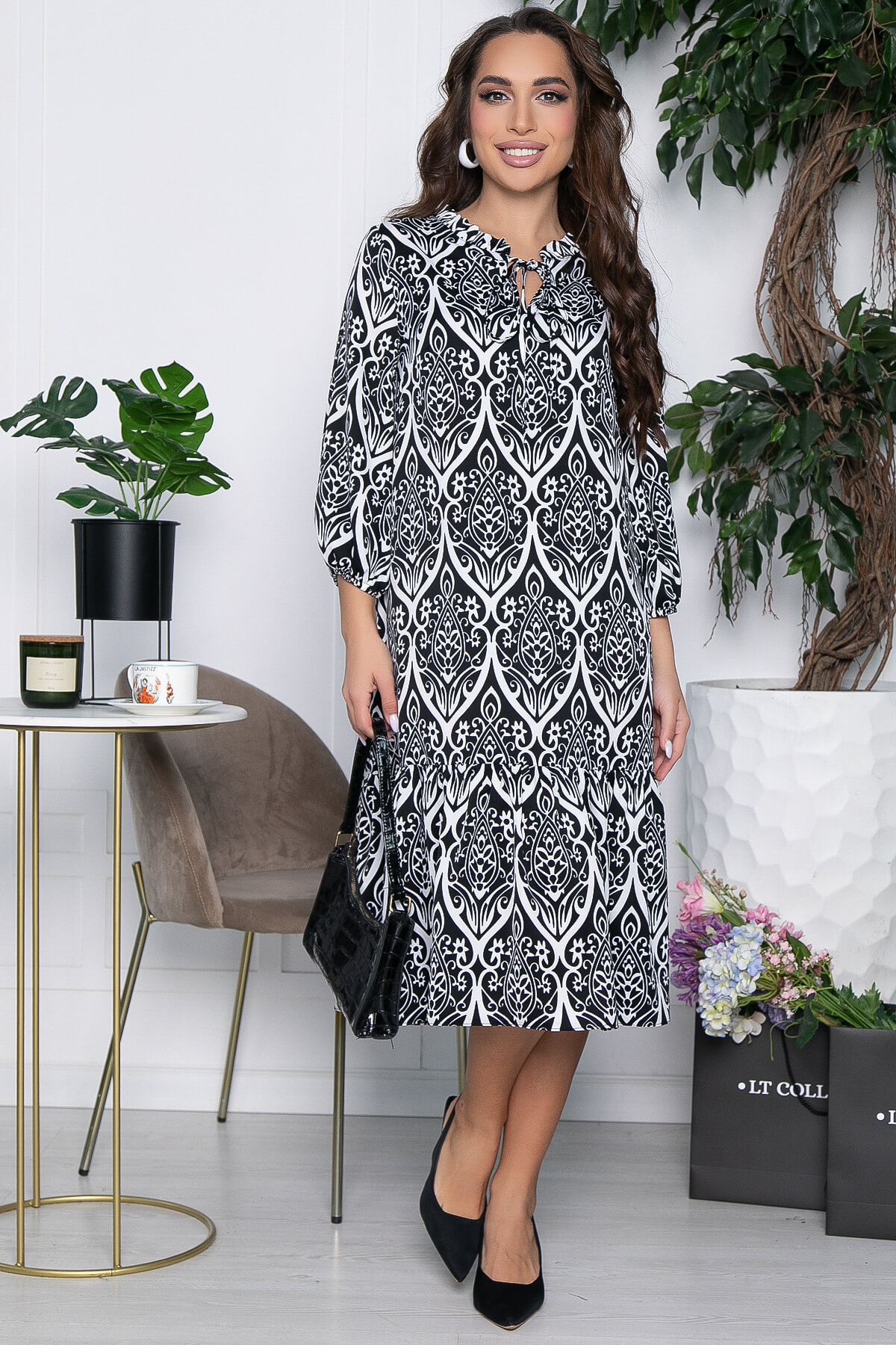 Чёрное платье с узорами - отличный выбор для комфортного повседневного образа! Легкое платье подходит для любого повседневного случая или особых мероприятий. Оно наполнит ваш образ легкостью и грацией, подчеркивая вашу индивидуальность. Платье с поясом, внизу волан. Рукав 3/4, низ рукава на резинке.