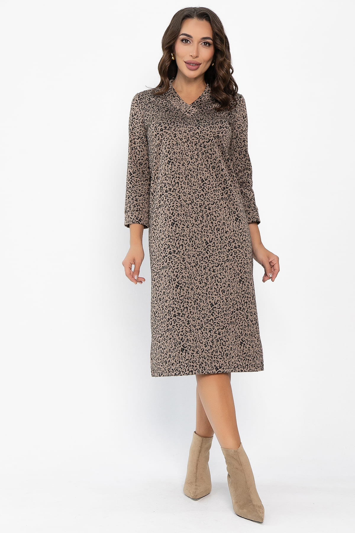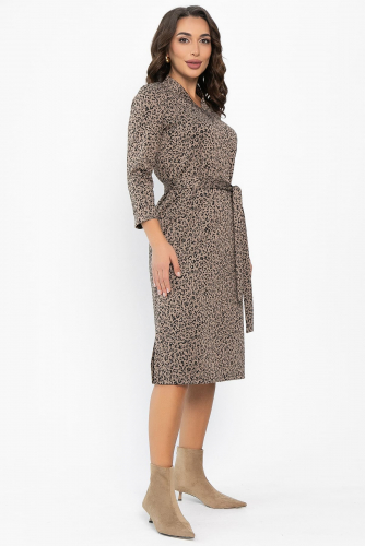 Трикотажное платье в оттенке капучино с леопардовым принтом станет прекрасным дополнением в вашем гардеробе. Пояс из основной ткани, входящий в комплект, поможет подчеркнуть талию. Рукава длиной 3/4 оканчиваются манжетом. Создано для тех, кто ценит удобство, элегантность и индивидуальность стиля одновременно. Идеальное решение для повседневности, офиса или вечернего выхода.