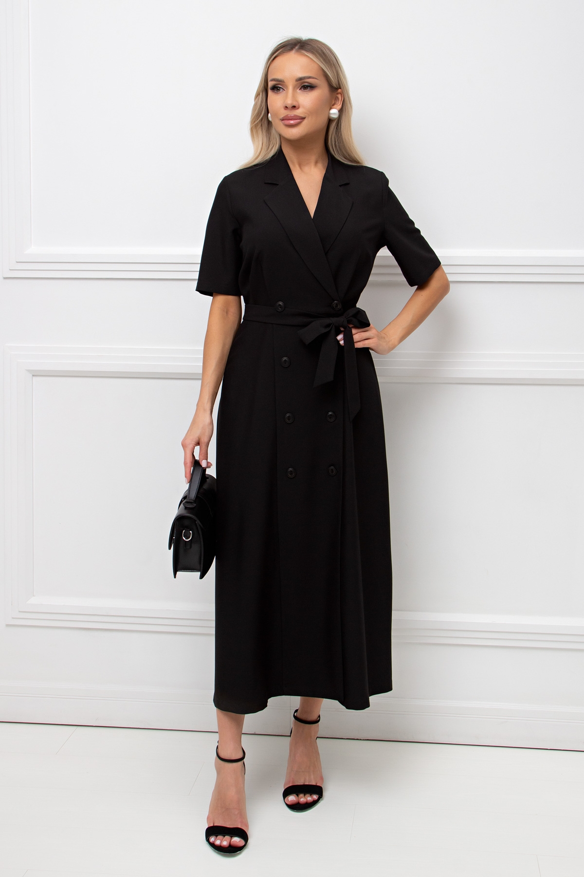 Элегантное платье приталенного силуэта выполнено из плательно-костюмной ткани. Горловина оформлена английским воротником. По переду выполнена двубортная застежка на петли и пуговицы. Рукав втачной, короткий. Модель отрезная по линии талии. Пояс из основной ткани в комплекте.