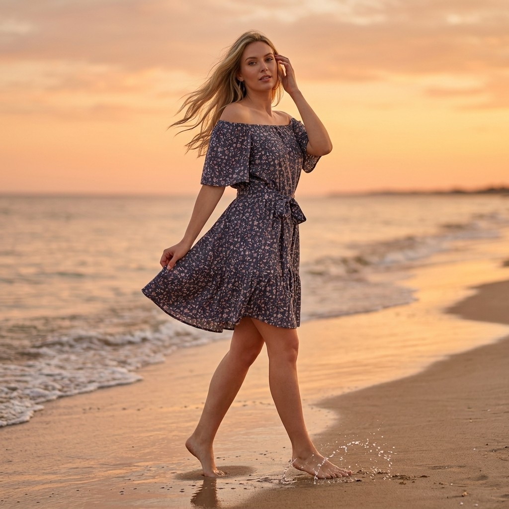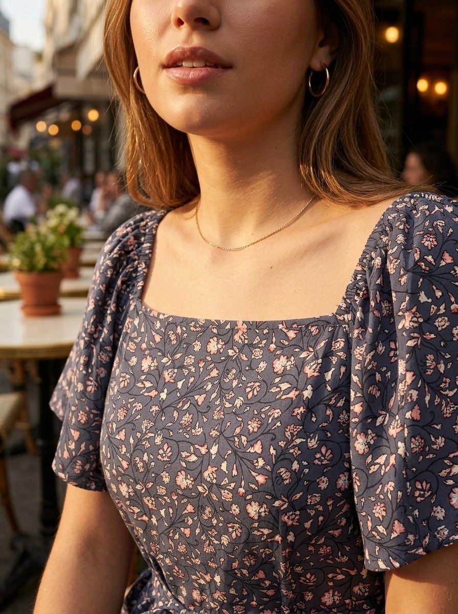 Платье молодежное из тканого полотна «штапель» с набивным рисунком, длиной до колена, свободного покроя, отрезное по линии талии, вытачками в области груди, с широкими рукавами на основе «реглан». Горловина прямоугольной формы – расширенная и углубленная. Рукава присборены по верхним срезам при помощи эластичной тесьмы в краевых швах. Верхние срезы спинки и полочек, образующие горловину, окантованы основным материалом. Юбка присборена по швам соединения с лифом с помощью эластичной тесьмы, понизу - оборка. Изделие комплектуется съемным поясом, завязывающимся на талии.