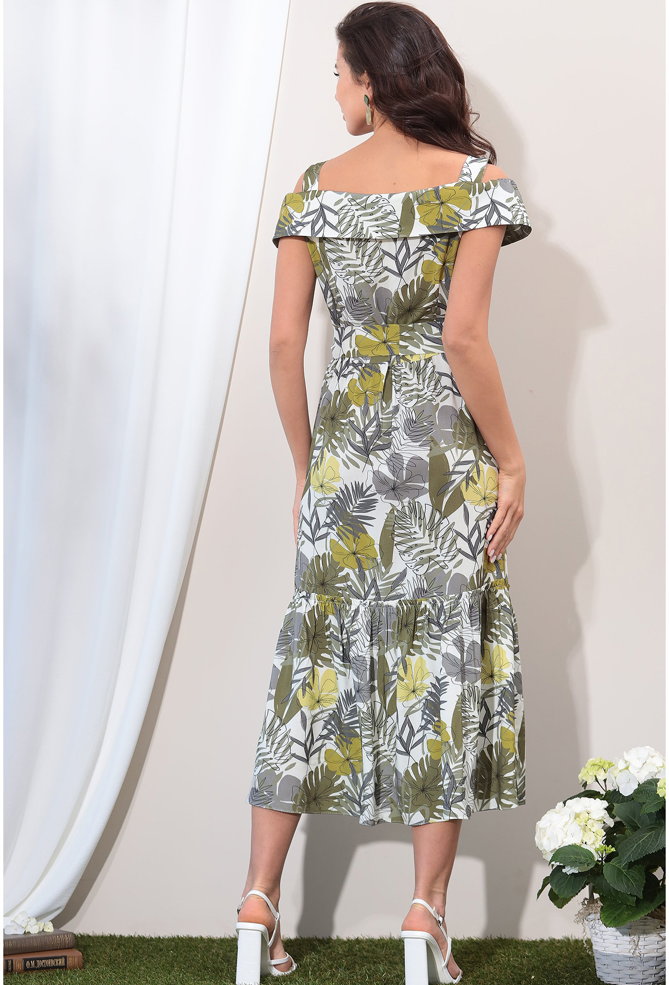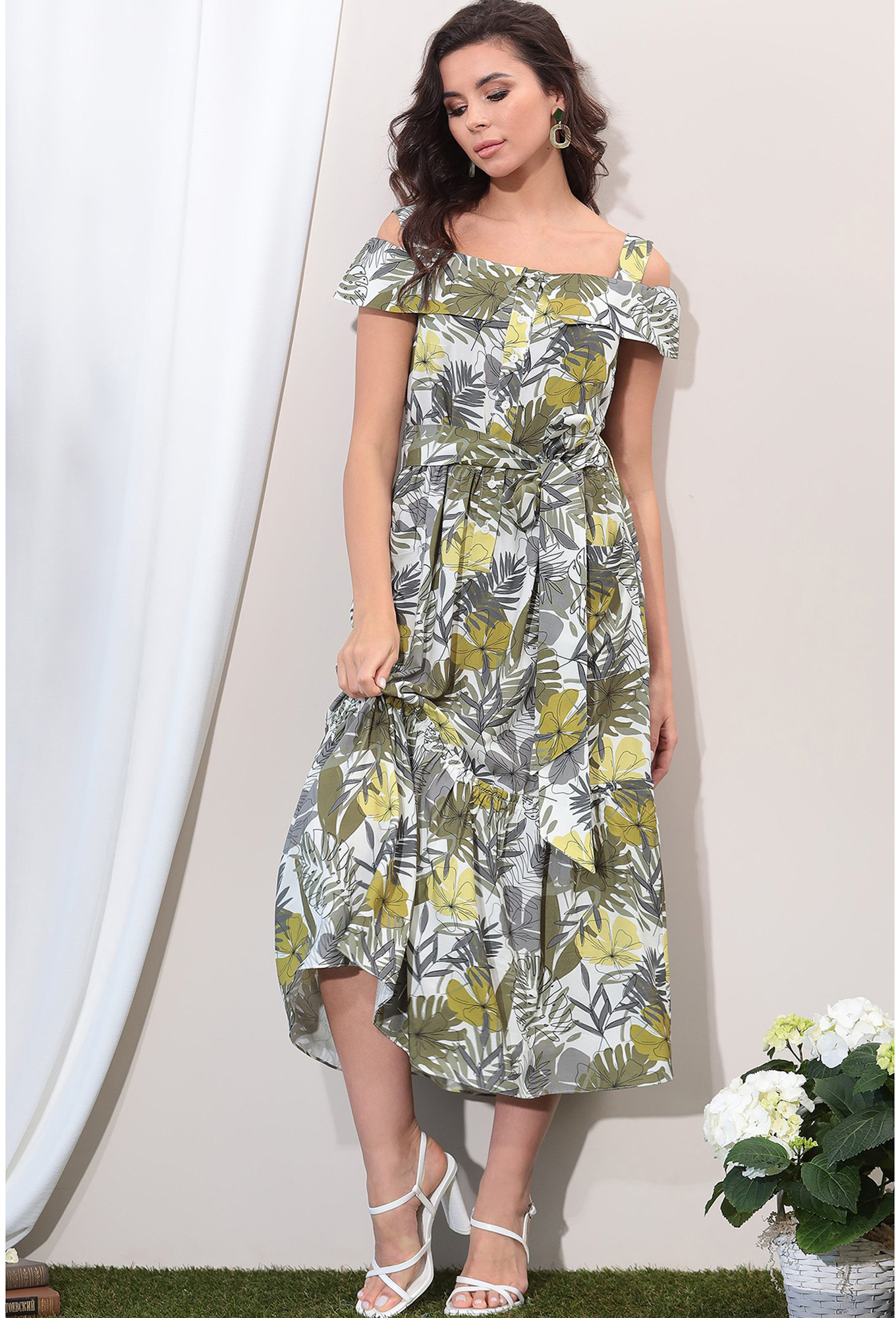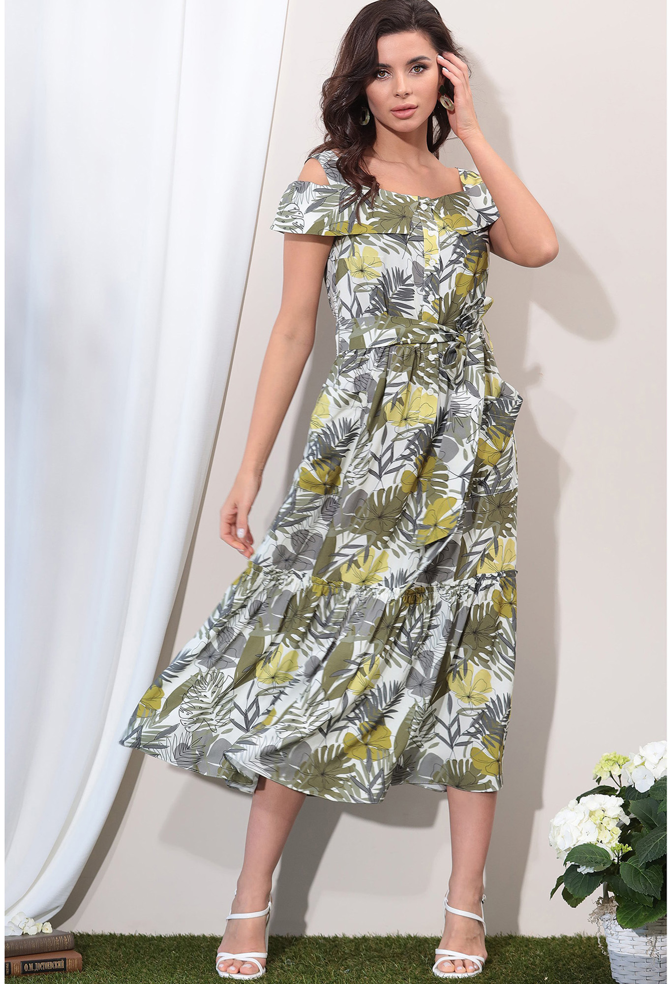 Модель: Лената 11115 листья Рост:..показать 164-170 см (рост модели на фото 170см) Сезон: Весна - Лето Тип ткани: 100% вискозаПлатье свободного силуэта с подкладкой по юбке из штапеля.Отрезное по линии талии, юбка со сборкой и накладными карманами по переду. По лифу притачная планка застегивающаяся на петли и пуговицы. Воротник отложной с открытыми плечами на резинке, на бретелях. В комплект входит съемный пояс из основной ткани.