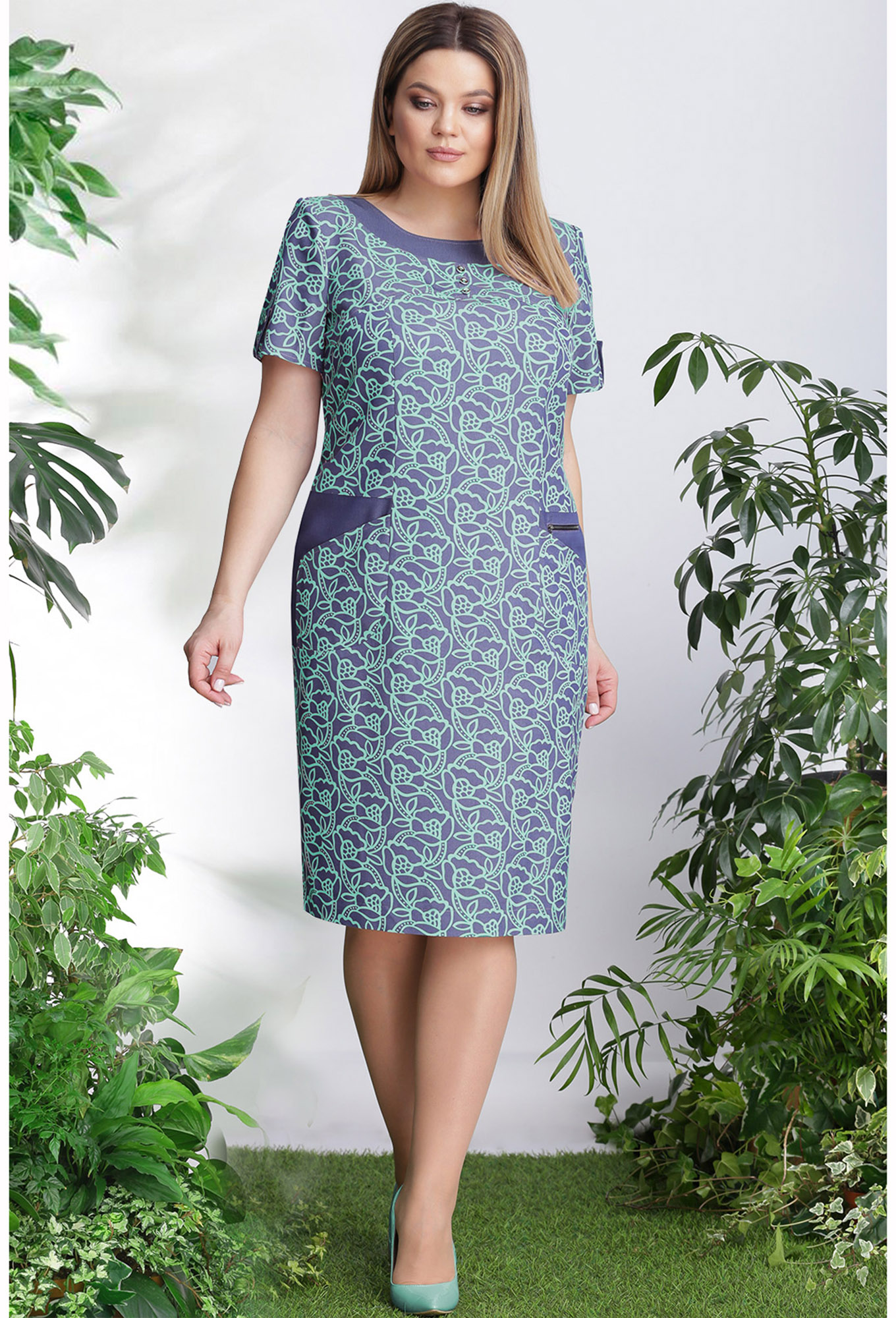 Модель: Лената 11905 мятный узор ..показатьРост: 164-170 см (рост модели на фото 170см) Сезон: весна-лето Тип ткани: вискоза 71%, полиэстер 27%, спандекс 2%Стильное платье из натуральной ткани для повседневной носки и для прогулок подарит Вам ощущение легкости и комфорта. Платье полуприлегающего силуэта без подкладки. Вырез горловины округлый с планкой и пуговицами на кокетке. По переду платья - накладные карманы, с декоративной молнией на одном из них. В среднем шве спинки - шлица. Рукав втачной короткий с патой на пуговицу. Застежка на потайную тесьму-молнию в левом боковом шве.Рост: 164-170 см (рост модели на фото 170см)