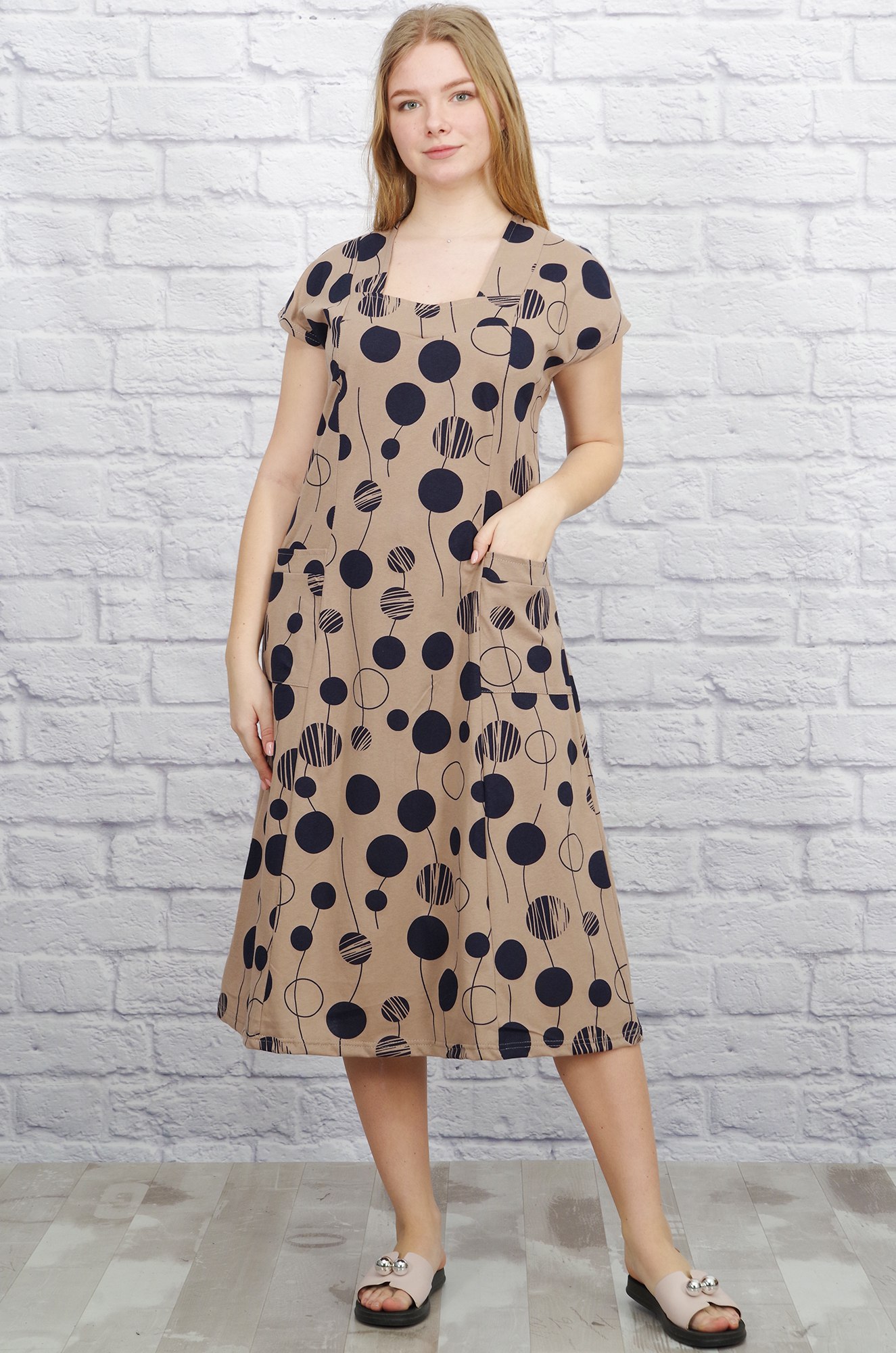 Хлопковое женственное платье с коротким рукавом. Модель приталенного силуэта, с глубокими рельфными вытачками, сзади завязывается поясок. Комфортная длина, оригинальный вырез, удобные накладные карманы. Ткань кулирка.