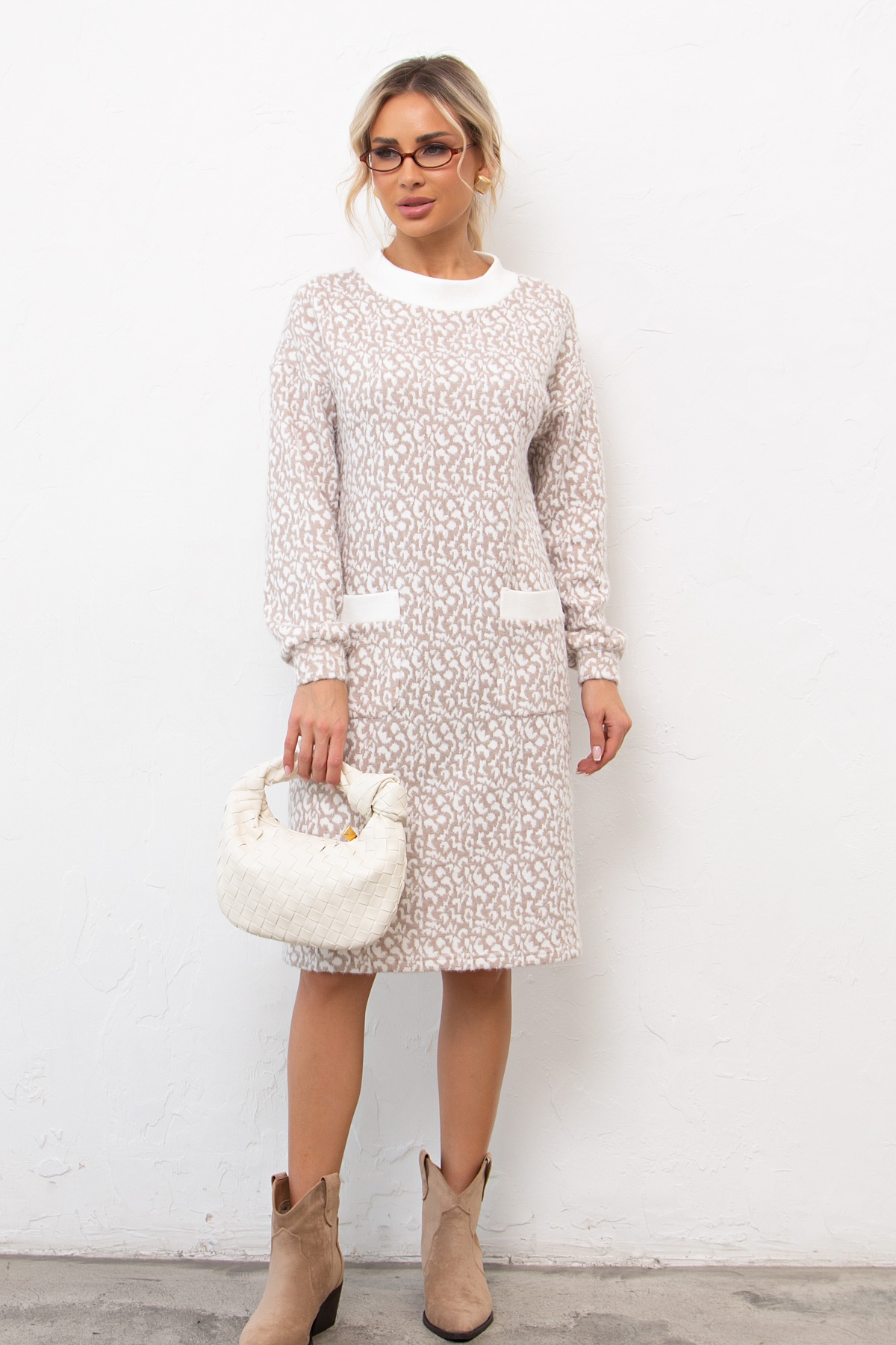 Комфортное платье прямого силуэта выполнено из трикотажного полотна "Ангора". Округлая горловина оформлена стойкой.