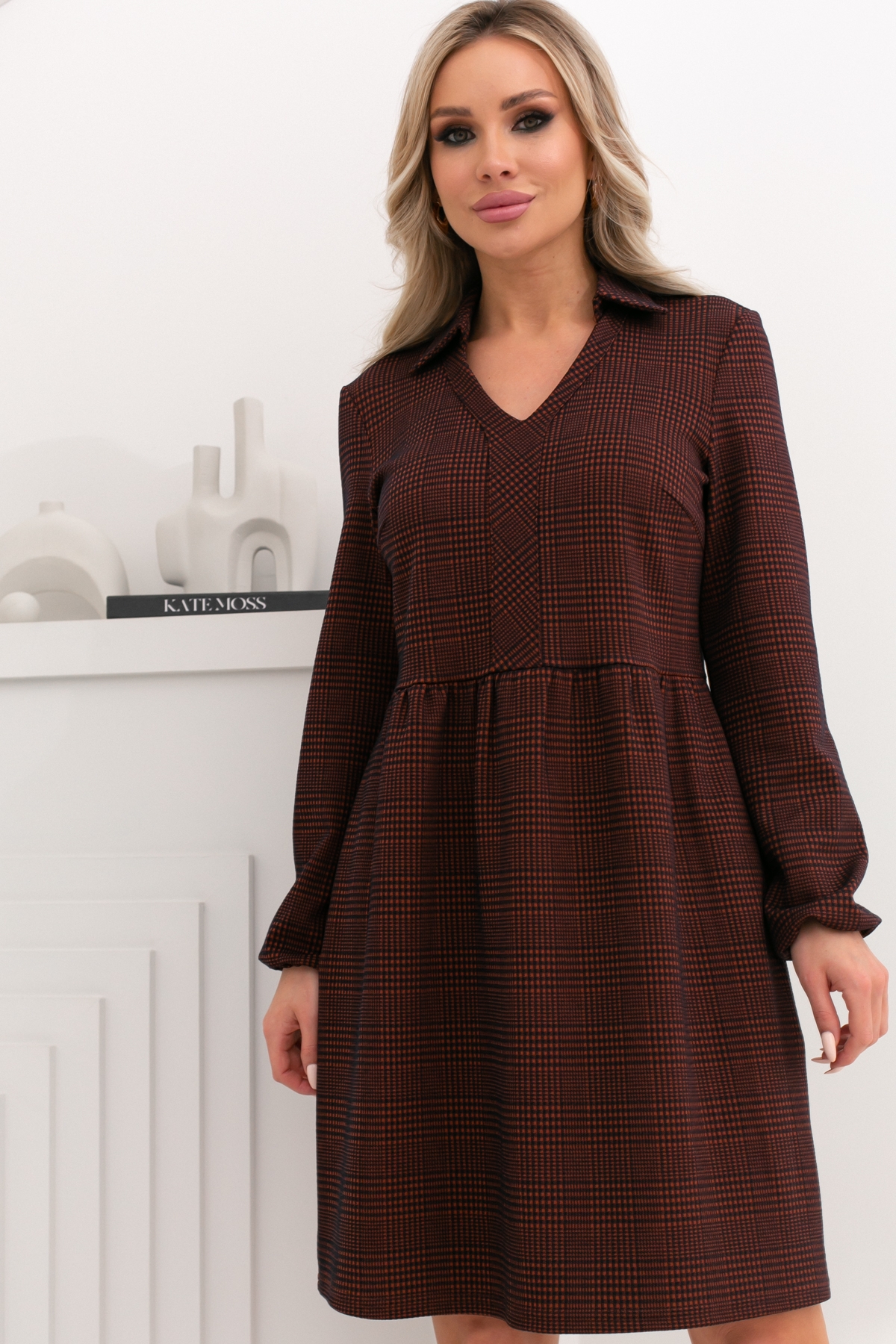 Комфортное платье А - силуэта выполнено из трикотажного полотна. Горловина оформлена отложным воротником на стойке, переходящим в V - образную горловину. Длинный втачной рукав по низу присборен на эластичную резинку. Модель отрезная по линии талии, на сборке. Низ ровный, без разрезов.