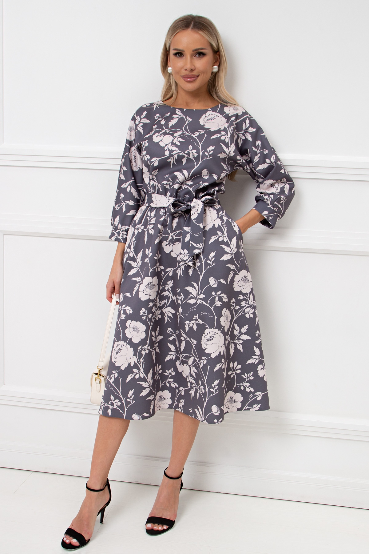 Женственное платье приталенного силуэта из плательно - костюмной ткани. Округлая горловина на внутренней обтачке. Цельнокроеный рукав - летучая мышь оканчивается притачной манжетой. Модель отрезная по линии талии присборена на резинку. Юбка расклешенного силуэта в боковых швах функциональные карманы. Низ ровный, без разрезов. Пояс из основной ткани в комплекте.