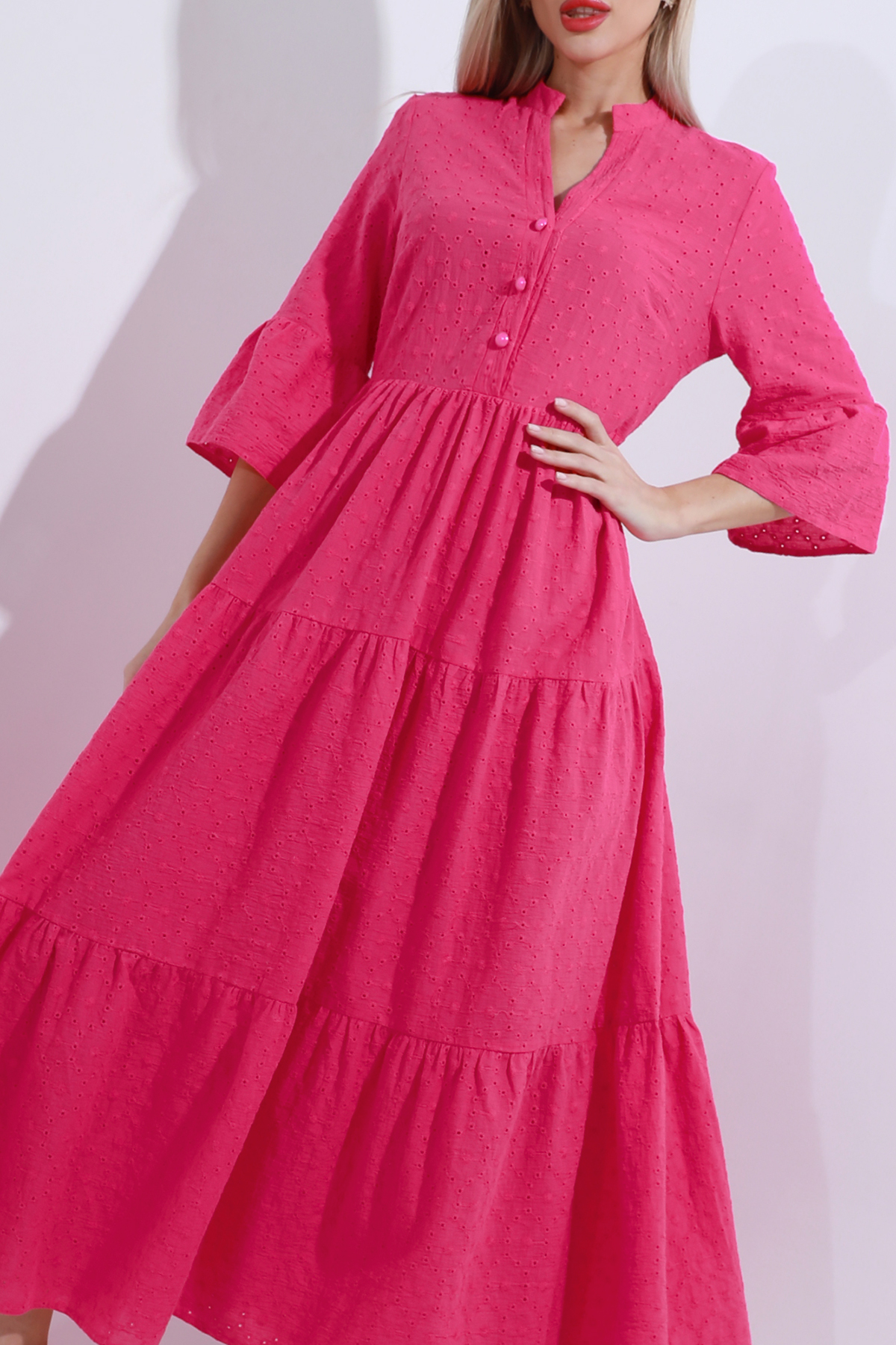 Летнее яркое длинное платье — это идеальный выбор для тех, кто ценит стиль и комфорт в повседневной одежде. Платье выполнено из плательной ткани, которая обеспечивает легкость и воздухопроницаемость, что особенно важно в жаркие летние дни. Основной особенностью этого платья является его яркий и насыщенный цвет, который привлечет внимание и поднимет настроение. Оно идеально подходит для повседневного ношения, создавая легкий и непринужденный образ. Плательная ткань приятна на ощупь и обеспечивает комфорт на протяжении всего дня. Воротник-стойка добавляет нотку утонченности и прекрасно сочетается с общим стилем платья. Модель платья выполнена в А-силуэте, который является одним из самых универсальных и популярных силуэтов. А-силуэт подчеркивает талию и плавно расширяется к низу, создавая женственный и романтичный образ. Такой крой подходит для всех типов фигур, делая платье доступным и комфортным выбором для каждой женщины. Рукава длиной 3/4 добавляют платью элегантности и утонченности. Для ухода за этим платьем рекомендуется бережная стирка при температуре 30 градусов.