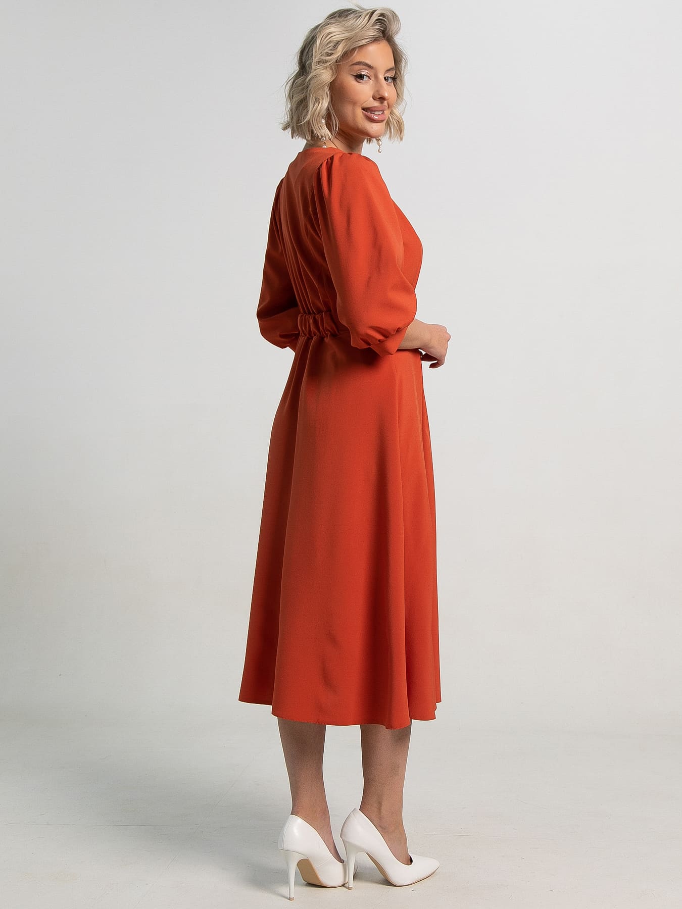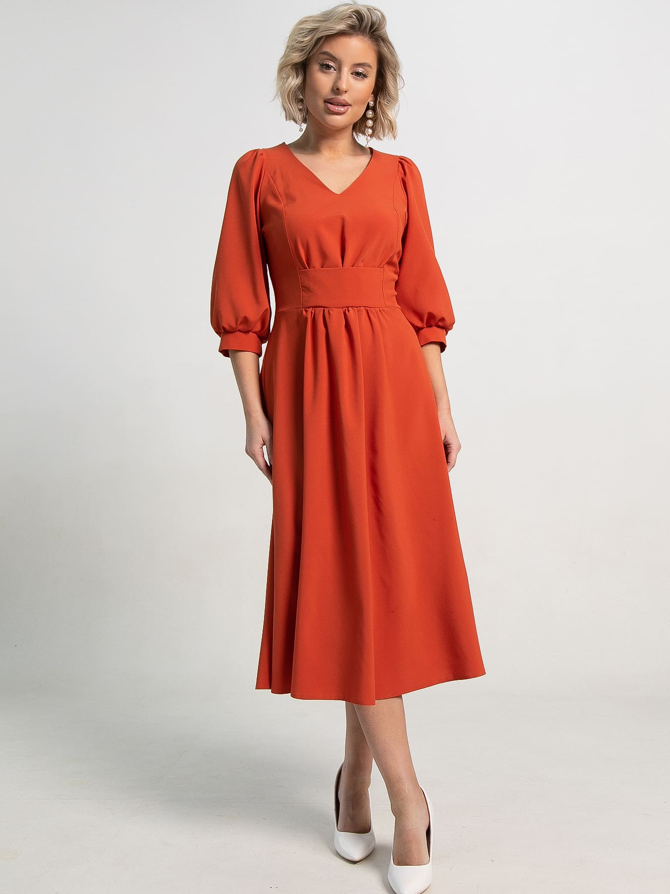 Платье средней длины с приталенным силуэтом станет настоящим украшением вашего гардероба! Благодаря отрезной линии талии оно подчёркивает фигуру, а расклешенная юбка придаёт образу лёгкость и женственность. Рукав-реглан средней длины на сборке завершается изящным манжетом, что делает платье ещё более утончённым. V-образная горловина добавляет в образ нотку изящества. Спереди платье украшено декоративным элементом в виде сборки, которую аккуратно закрывает втачной пояс. Сзади пояс аналогичный и собран на широкую резинку.
