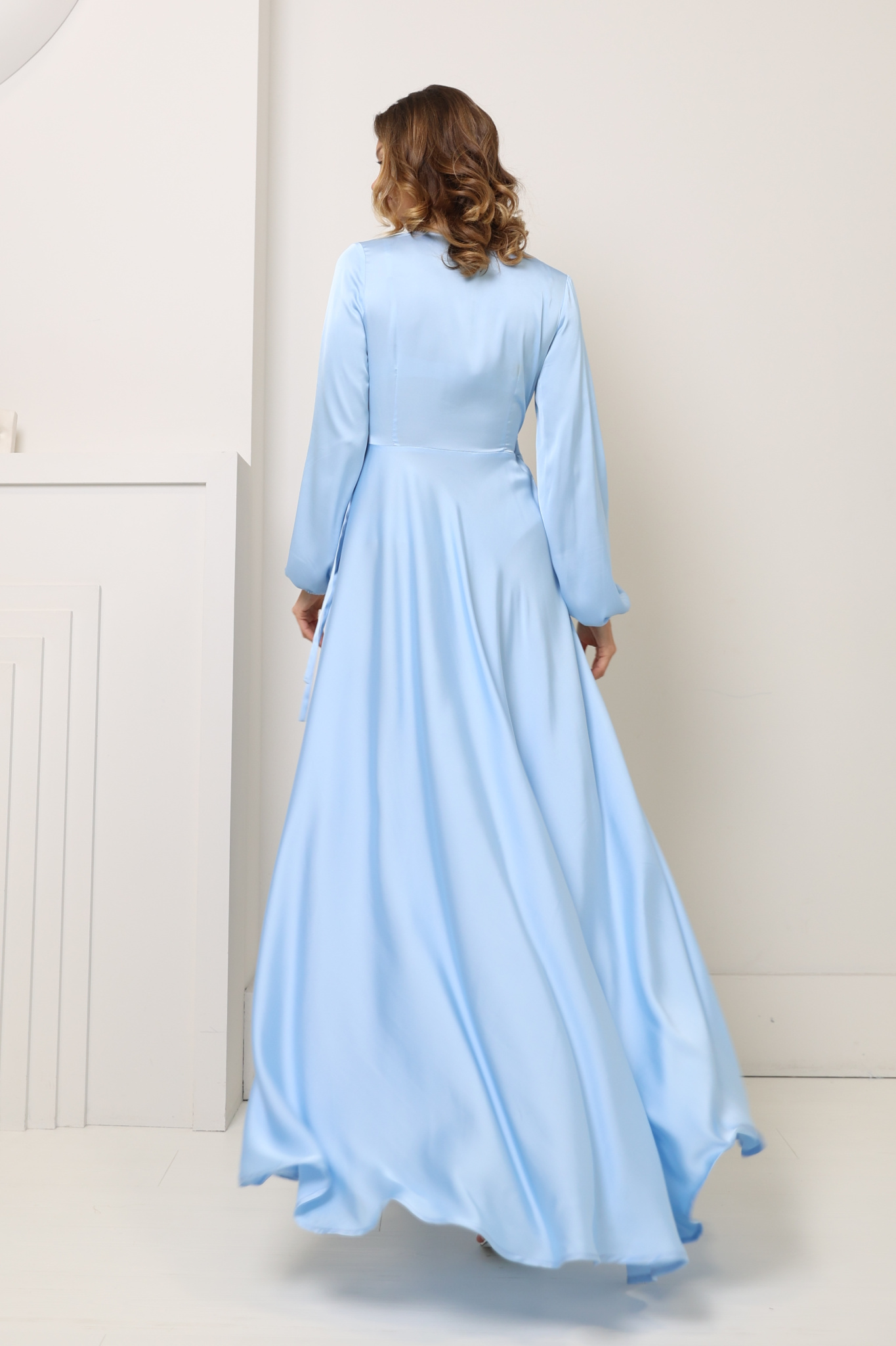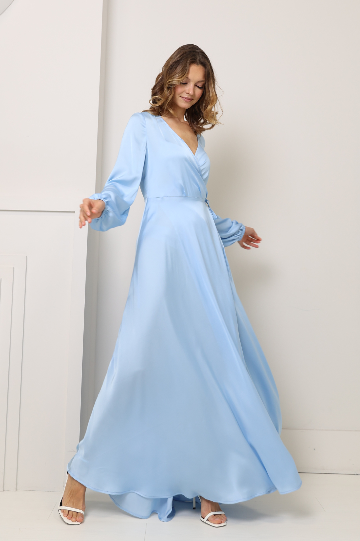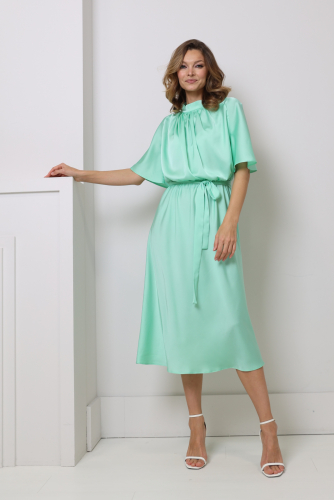 Платье миди из шёлка на запах. Длинный рукав среднего объёма с резинкой по манжету.