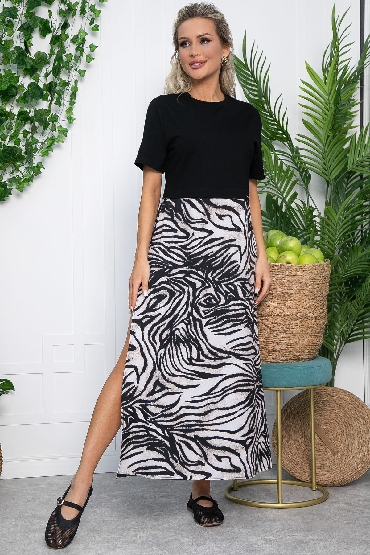 Летнее платье-футболка с разрезами по бокам — это превосходное сочетание комфорта и стиля. Благодаря отрезному крою по талии, оно идеально подчеркивает фигуру и обеспечивает превосходную посадку. Изюминкой этой модели является гармоничное сочетание двух различных тканей: однотонный верх платья выполнен из трикотажа, а низ — из ниагары с анималистичным принтом. Сочетайте это платье с кроссовками для активного дня или с элегантными сандалиями для вечерней прогулки — в любом случае вы будете выглядеть стильно и уверенно!