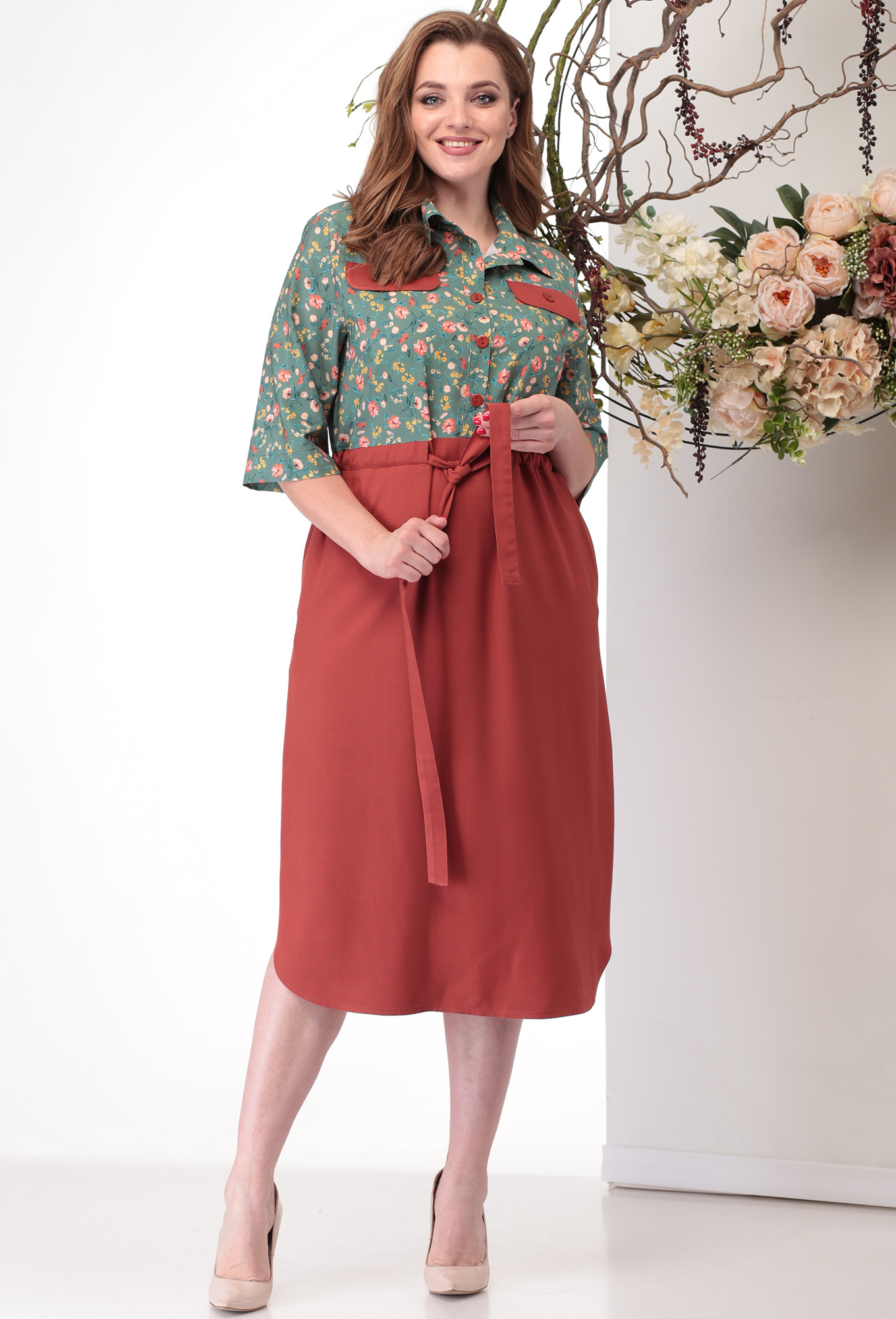 Модель: Мишель Шик 2011 терракот-зеленый..показатьli> Рост: 164 см (девушка на фото 170 см) Сезон: весна-лето Тип ткани: низ — 100% вискоза; верх — 100% полиэстерНарядное и яркое платье рубашечного типа выполнено из вискозы. Натуральные ткани, модный цвет и свободное прилегание сделают его одним из любимых вещей в вашем гардеробе. В юбке скругленный низ переходящему в разрезы, пояс на стяжке которой регулируется плотность прилегания, талия чуть завышена, что визуально удлиняет ноги и прячет возможные нюансы в фигуре. 3/4 рукав с манжетой, которую можно отложить укоротив тем самым длину. На груди клапаны имитирующие карман. Длина по спинке 118 см (±1 см), дина по спинке до пояса-резинки 48 см (±1 см), длина рукава от плечевого шва 46 см. Модель подойдет на рост 170 см.li>