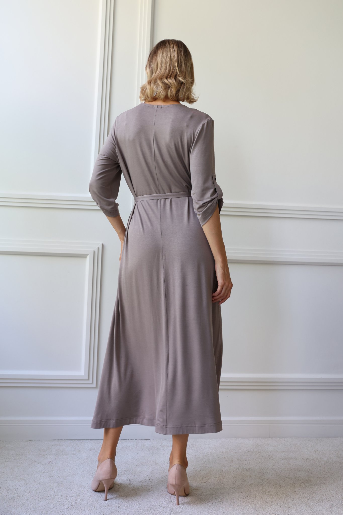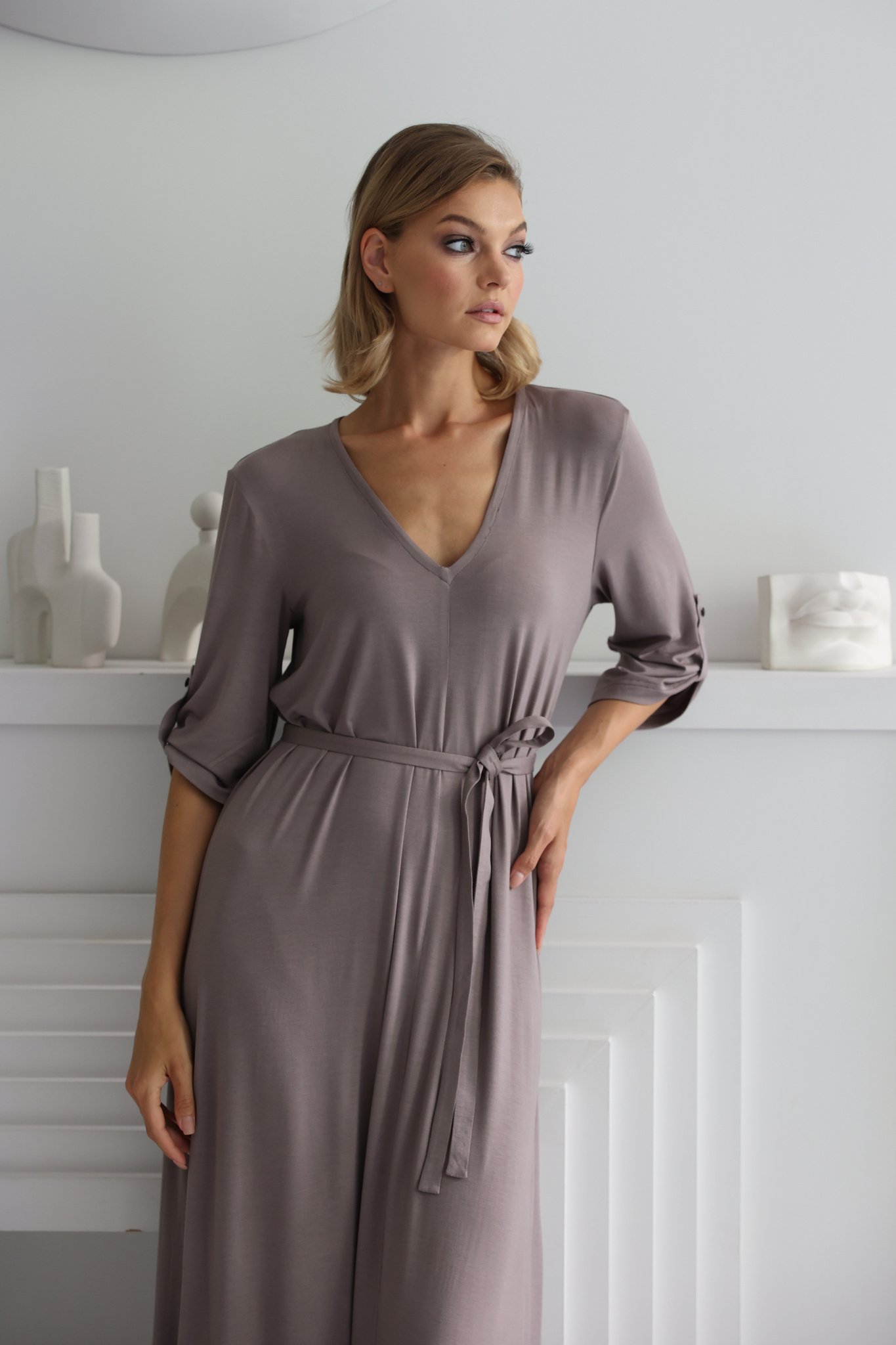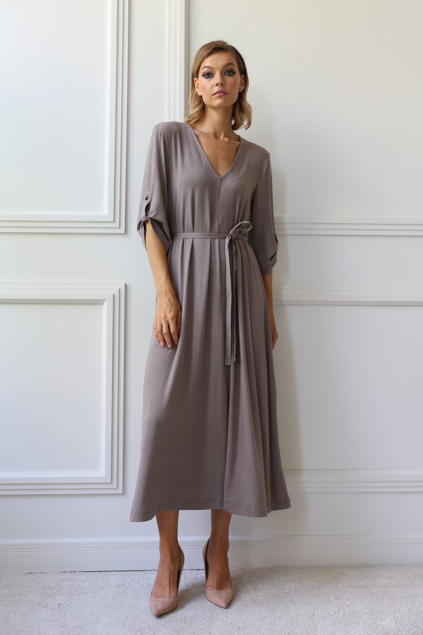 Платье миди свободного кроя с поясом в комплекте. Рукав 7/8 на патах. V-вырез горловины.