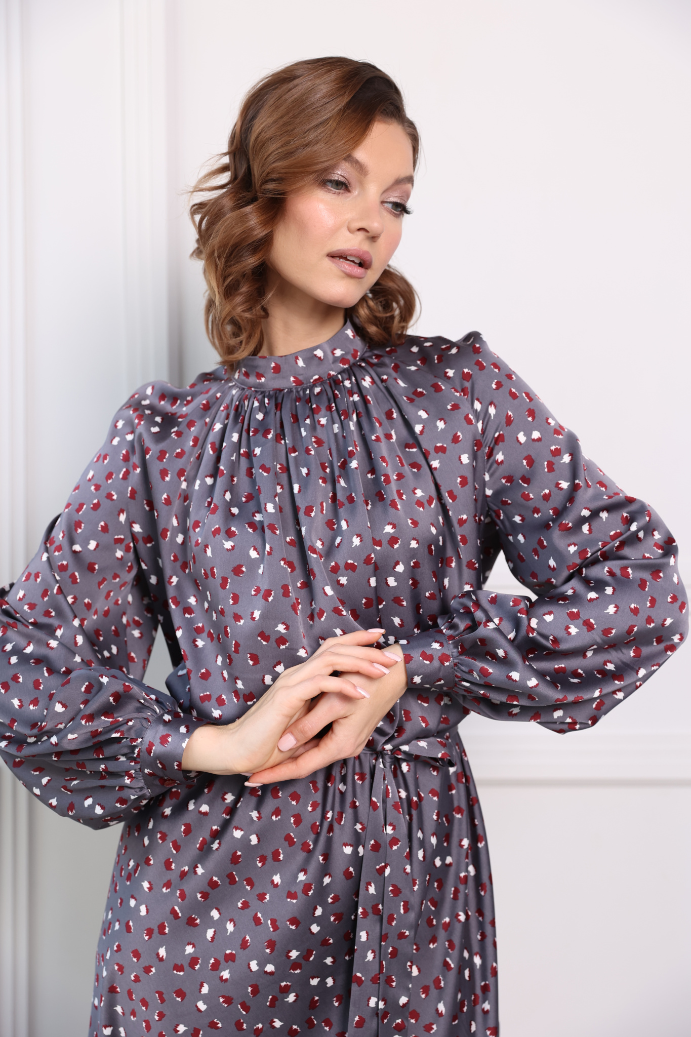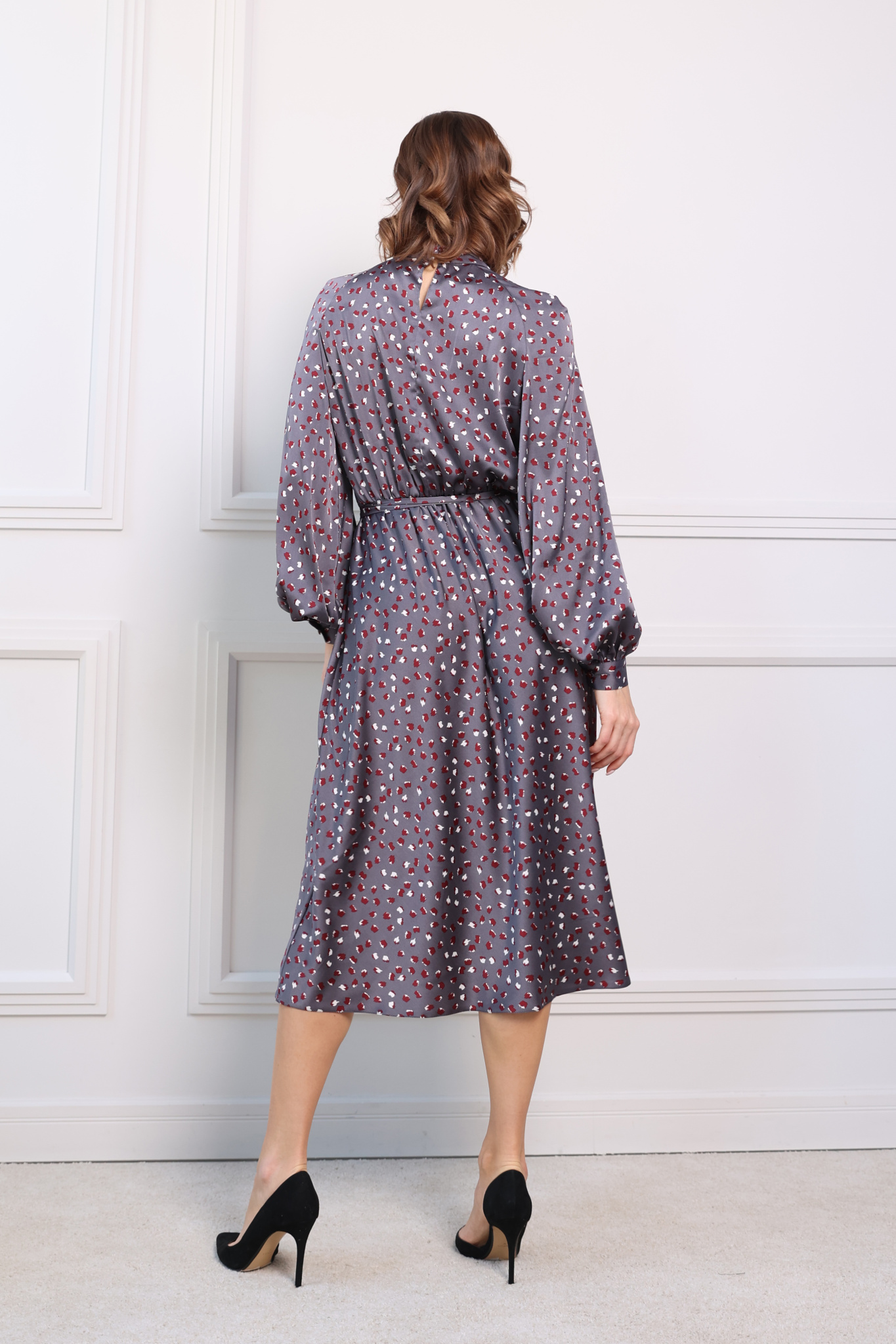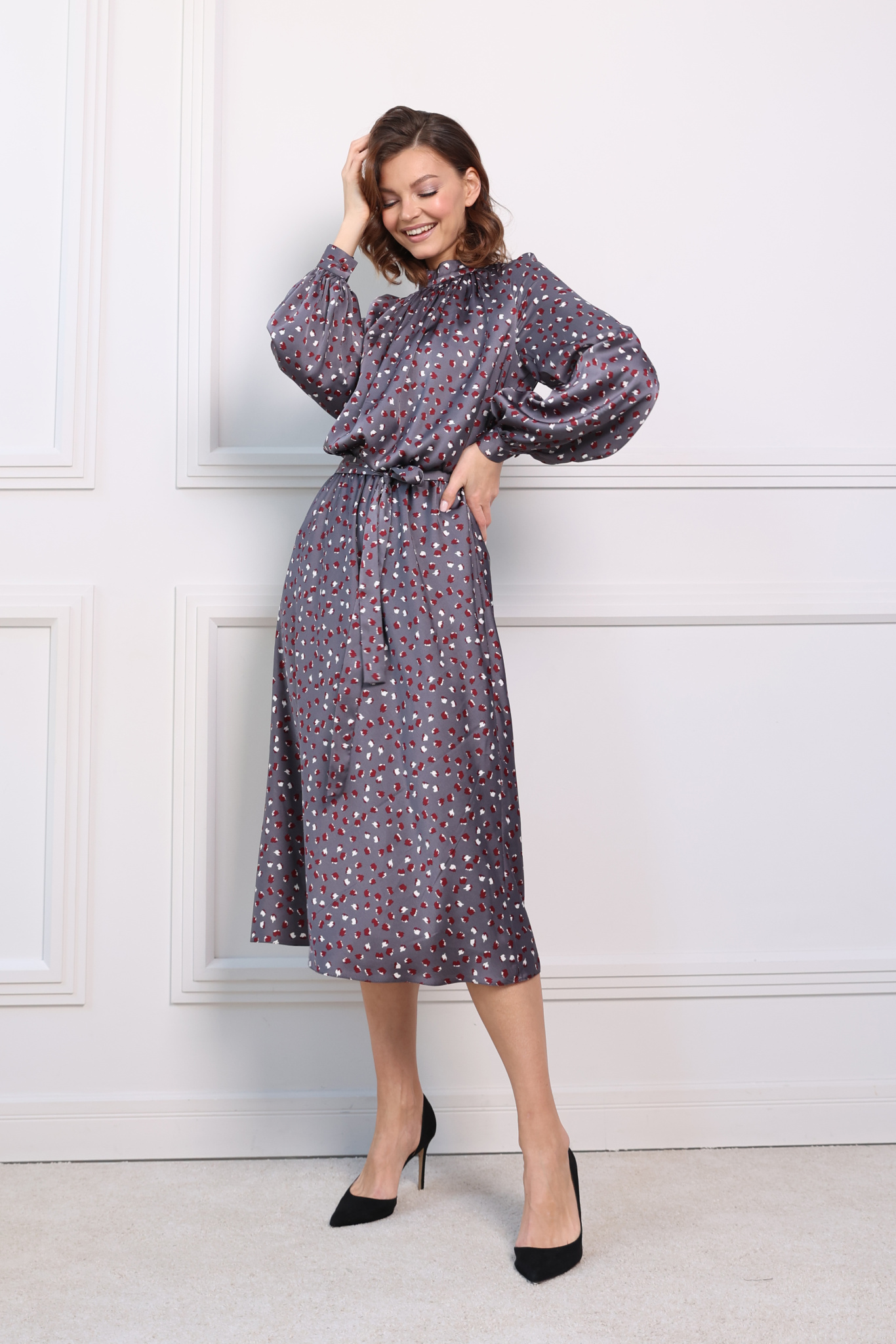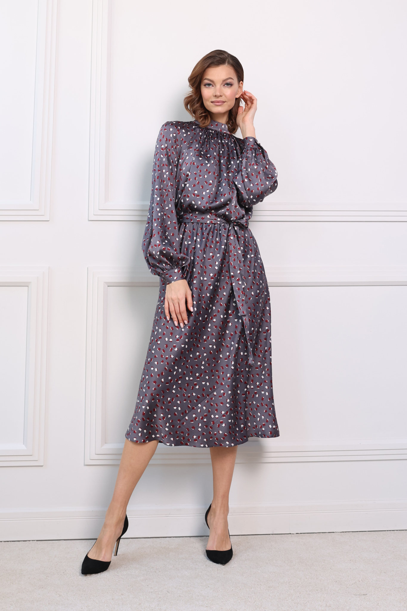 Платье миди с юбкой- трапеция, с резинкой по линии талии. Сборка по переду лифа переходит в воротник-стойку, застёгивается сзади на пуговицу. Пышный рукав на манжете.