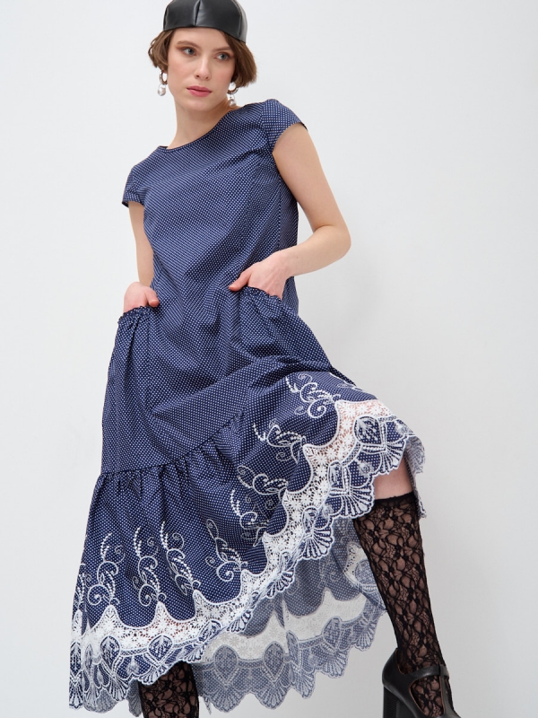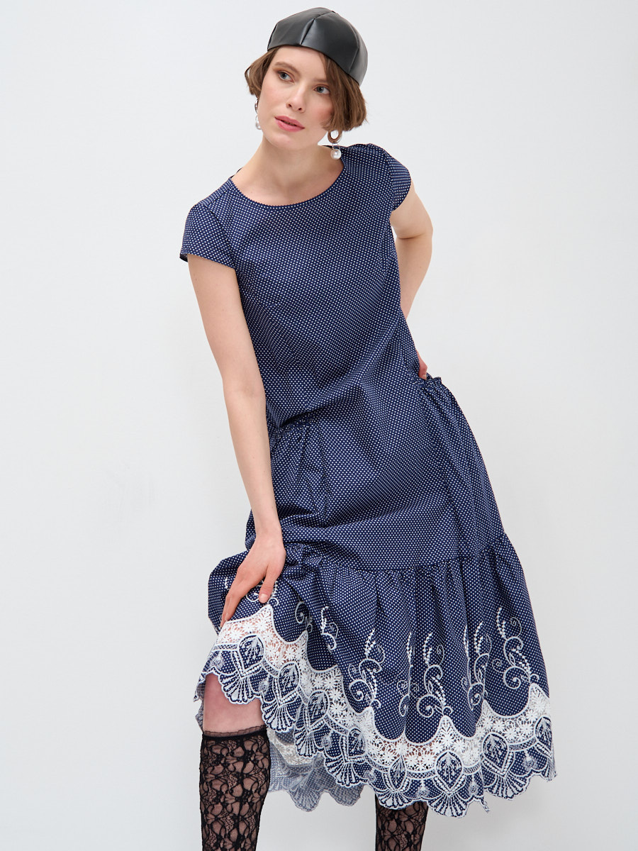 Повседневное платье полуприлегающего силуэта с отрезным бочком, нагрудными вытачками, коротким рукавом и воланами по части бока и низу. Рост модели 170 см. Размер изделия 42. Только ручна стирка.