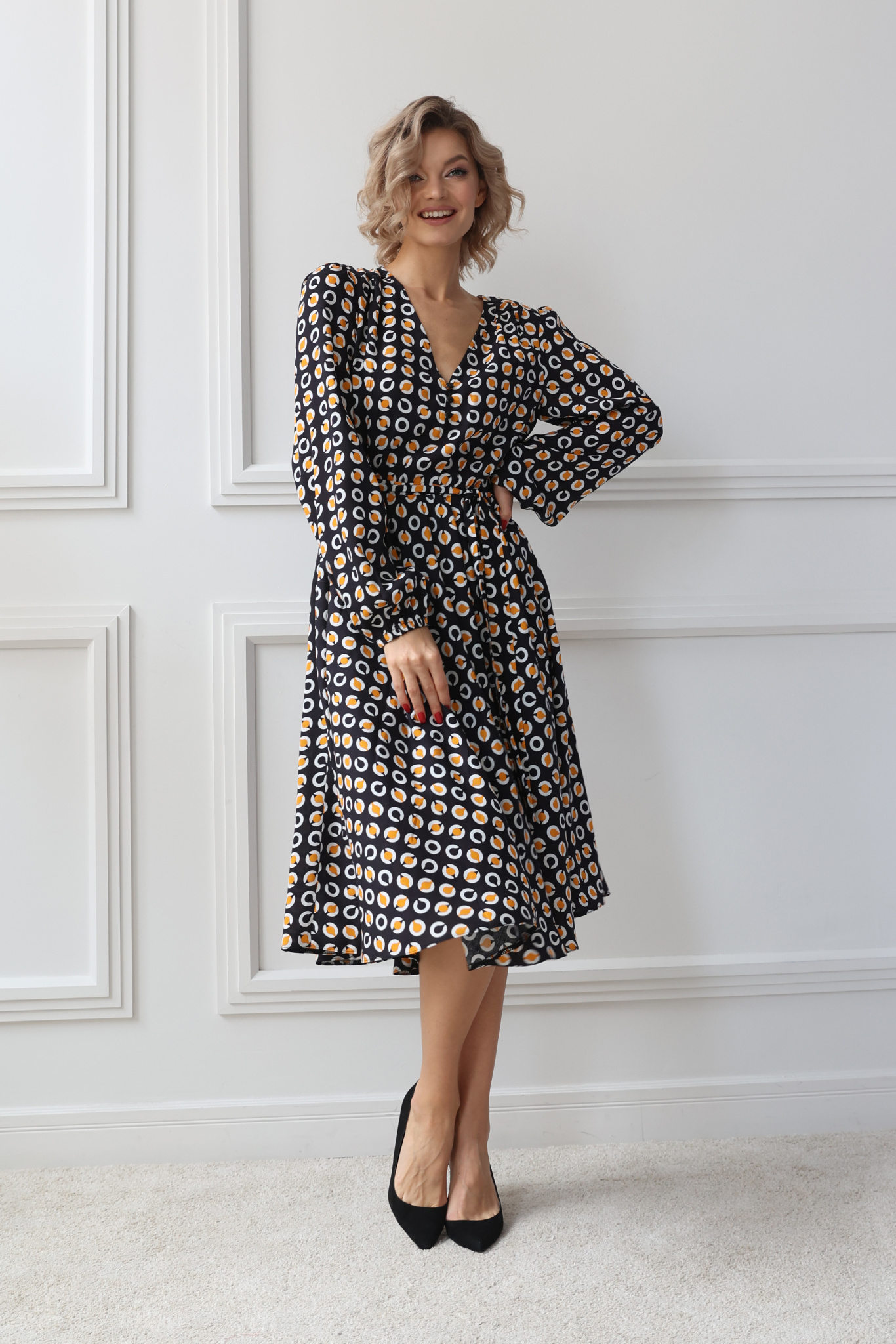 Платье миди с юбкой-полусолнце, с резинкой по линии талии. Глубокий вырез, с застёжкой на пуговицы, втачной рукав с манжетой на резинке. Пояс в комплекте