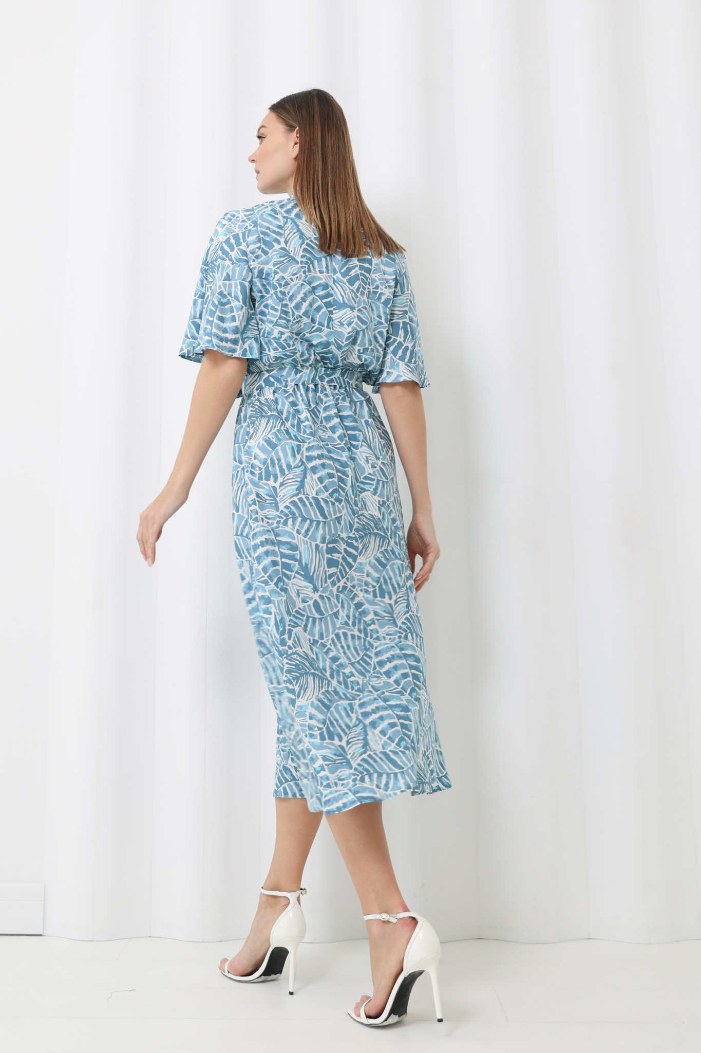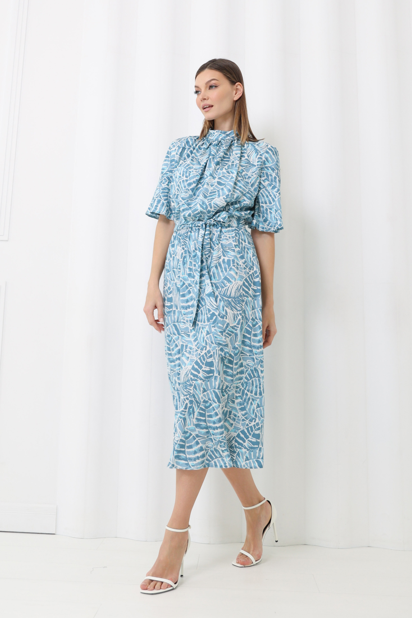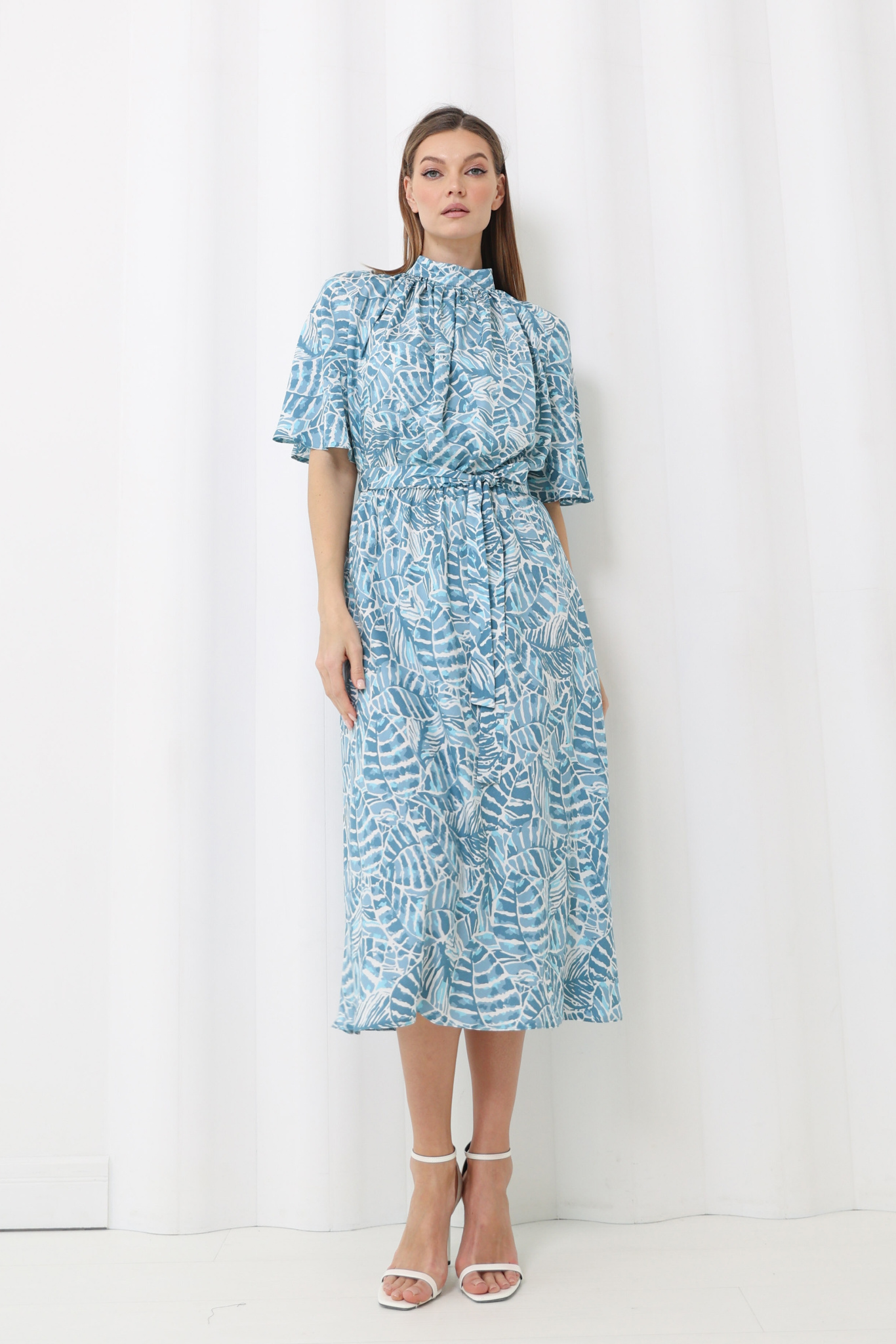 Платье миди с юбкой-трапецией, с резинкой по линии талии. Сборка по переду лифа переходит в воротник-стойку, застёгивается сзади на пуговицу.