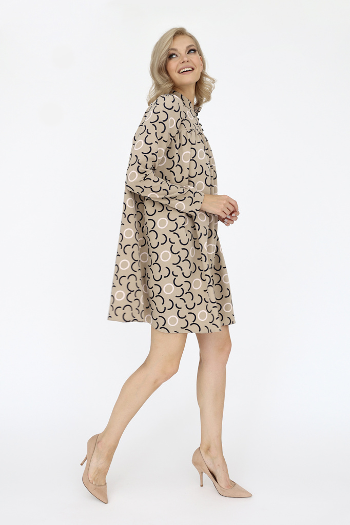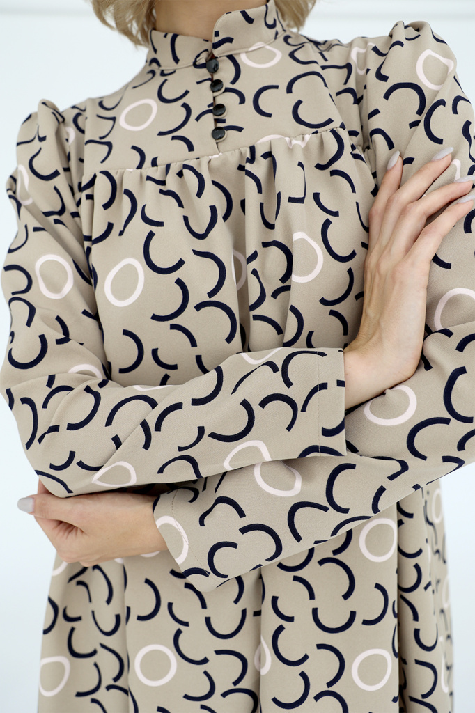 Платье свободного кроя со сборкой от кокетки по переду и спинке. Платье с воротником-стойкой, застегивается на пуговицы, расположенные на кокетке. Втачные рукава со сборкой по окату.