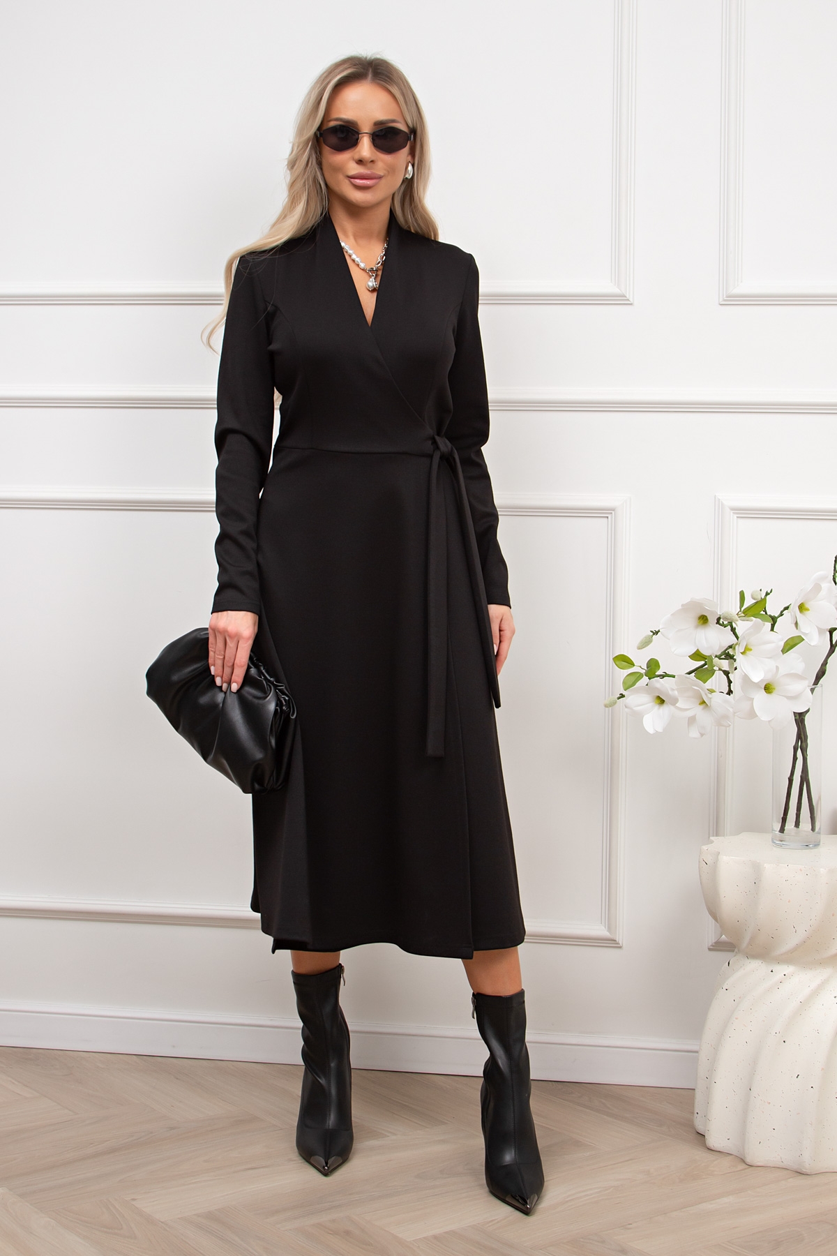 Женственное платье приталенного силуэта изготовлено из трикотажного полотна.V-образная горловина с цельнокроеной стойкой. Длинный втачной рукав. Модель отрезная по линии талии на запахе, сбоку пояс-завязка. Низ ровный, без разрезов.