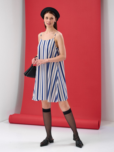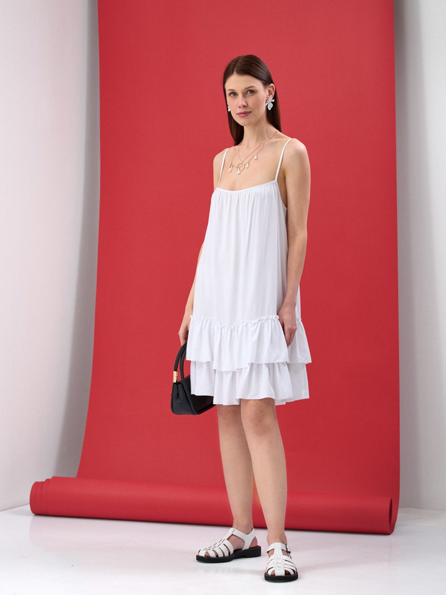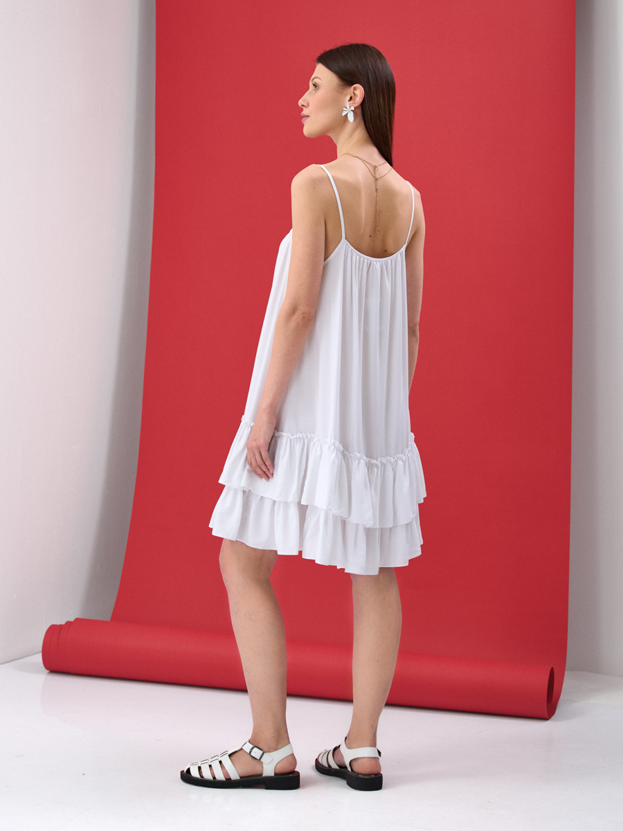 Платье – Трапеция из однотонного штапеля. На узких бретелях. Сборка по лифу спинки и полочки. По низу изделия 2 волана со сборкой. Рост модели 175 см. Изделие на модели 42р-ра. Длина изделия по спинке 74 см. Машинная стирка при 30