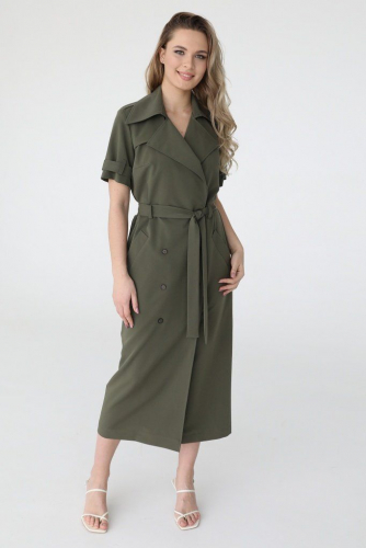 Платье с v-образным вырезом, рукавами 3/4 и двубортной застежкой на пуговицы.