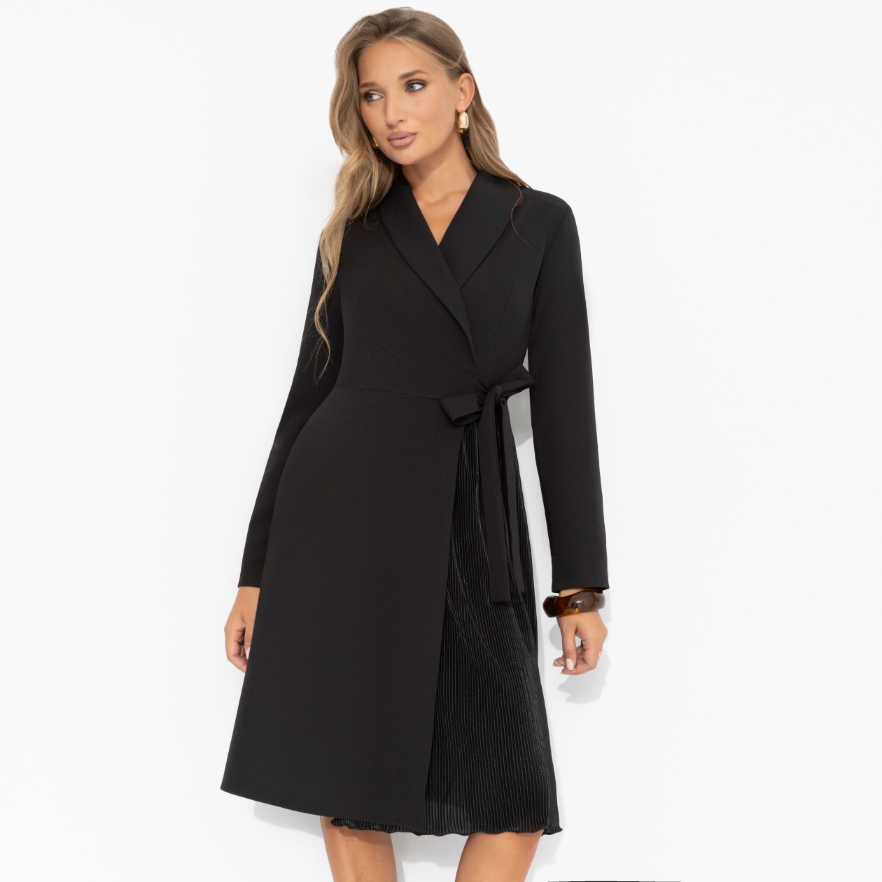 Элегантное платье от ЧАРУТТИ – идеальное решение для насыщенного дня, когда родительское собрание сменяется романтическим свиданием. Его лаконичный силуэт подчеркивает фигуру, не облегая навязчиво. Универсальный глубокий черный цвет и изящные линии создают образ собранный и строгий для школы, но в то же время загадочный и чувственный для вечера. В этом платье вы будете неотразимой мамой днём и очаровательной женщиной вечером, совершив безупречный переход в одной вещи. Платье в длине миди на запах. Приталенный силуэт формируется за счёт пояса. Платье с лацканами. Часть юбки выполнена из акцентного текстурного материала-гофре. Пояс вшит в изделие.