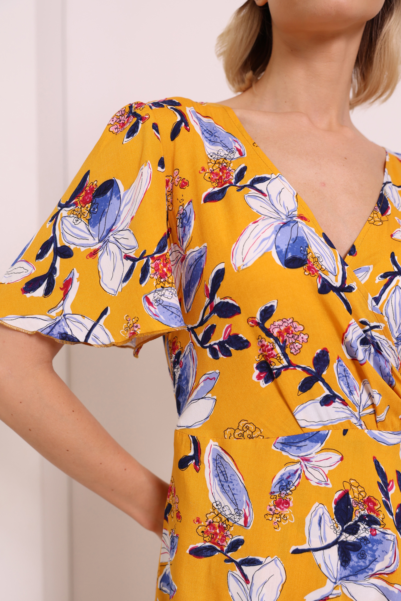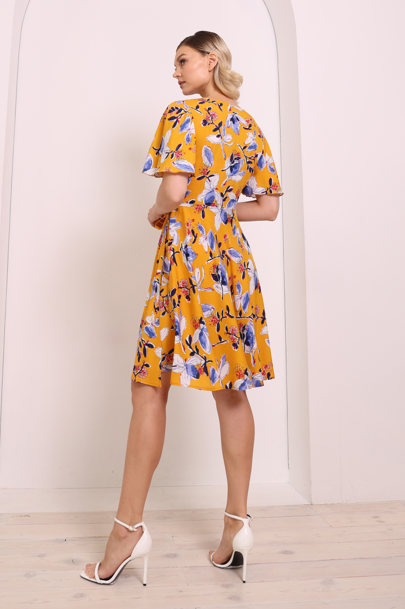 Платье на запах с юбкой-солнце. Короткий рукав-бабочка. Ткань: штапель-принт.