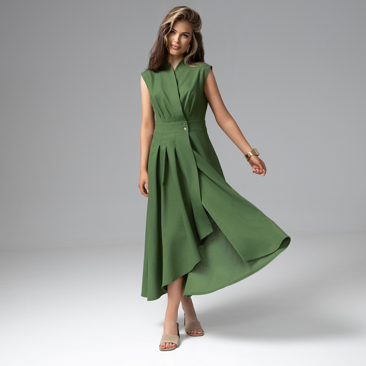 Лето умеет быть разным: шумным, солнечным, неожиданно тихим. Каким будет твое? Свежий травяной оттенок, лёгкое движение ткани и ощущение свободы, которое появляется вместе с тёплым ветром... Платье изо льна с вискозой дышит и красиво держит форму, создавая выразительную архитектуру силуэта. Асимметричная линия юбки и мягкие складки добавляют динамику при движении. Одно мы знаем точно: это лето будет особенно красивым.