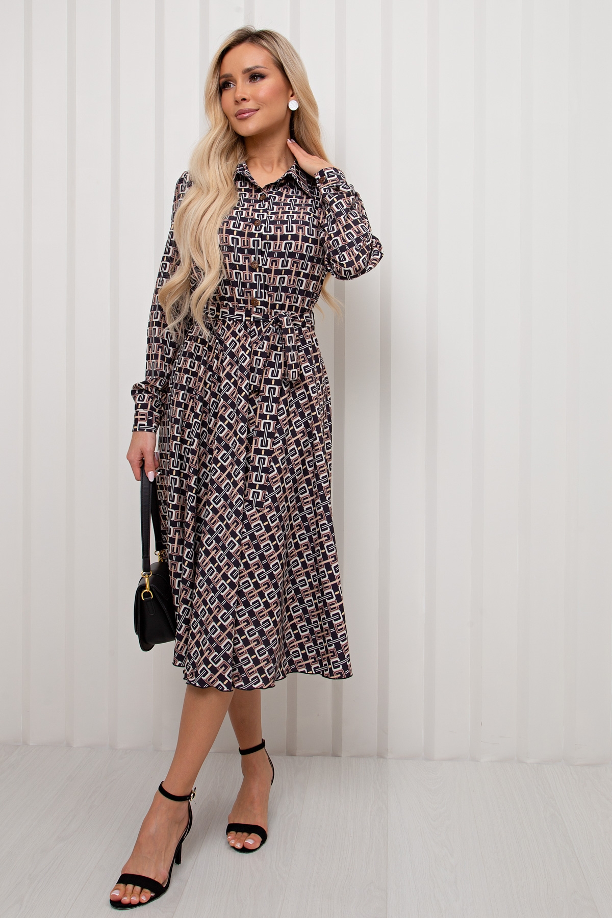Красивое платье приталенного силуэта из легкой ткани - ниагара. Горловина оформлена отложным воротником на стойке. По переду выполнена планка с застежкой на петли и пуговицы. Длинный втачной рукав, оканчивается притачной манжетой. В боковых швах функциональные карманы. Модель отрезная по линии талии, присобрана на эластичную резинку. Тканевый пояс дополнительно акцентирует талию. Модель прекрасно дополнит ваш гардероб.