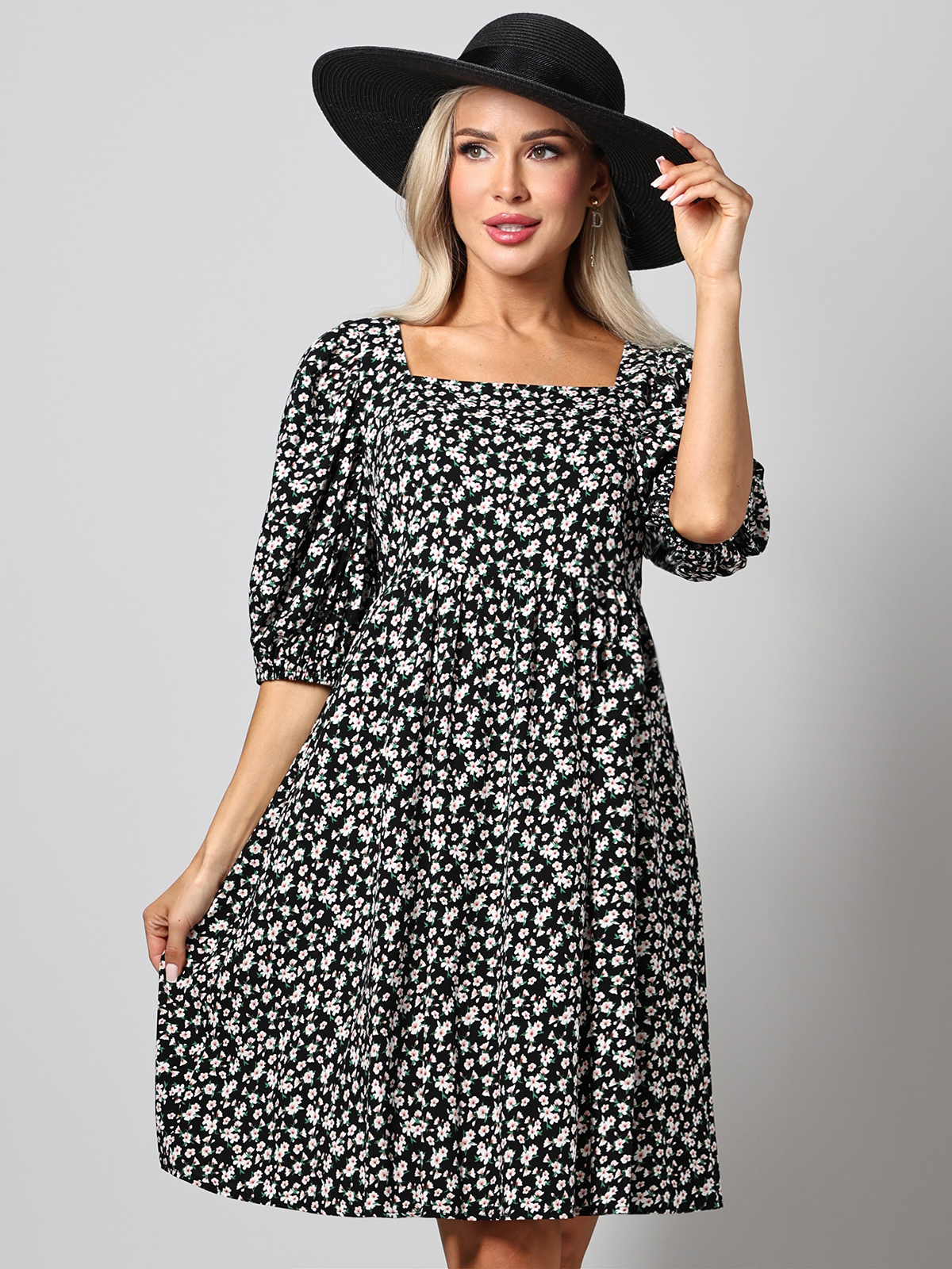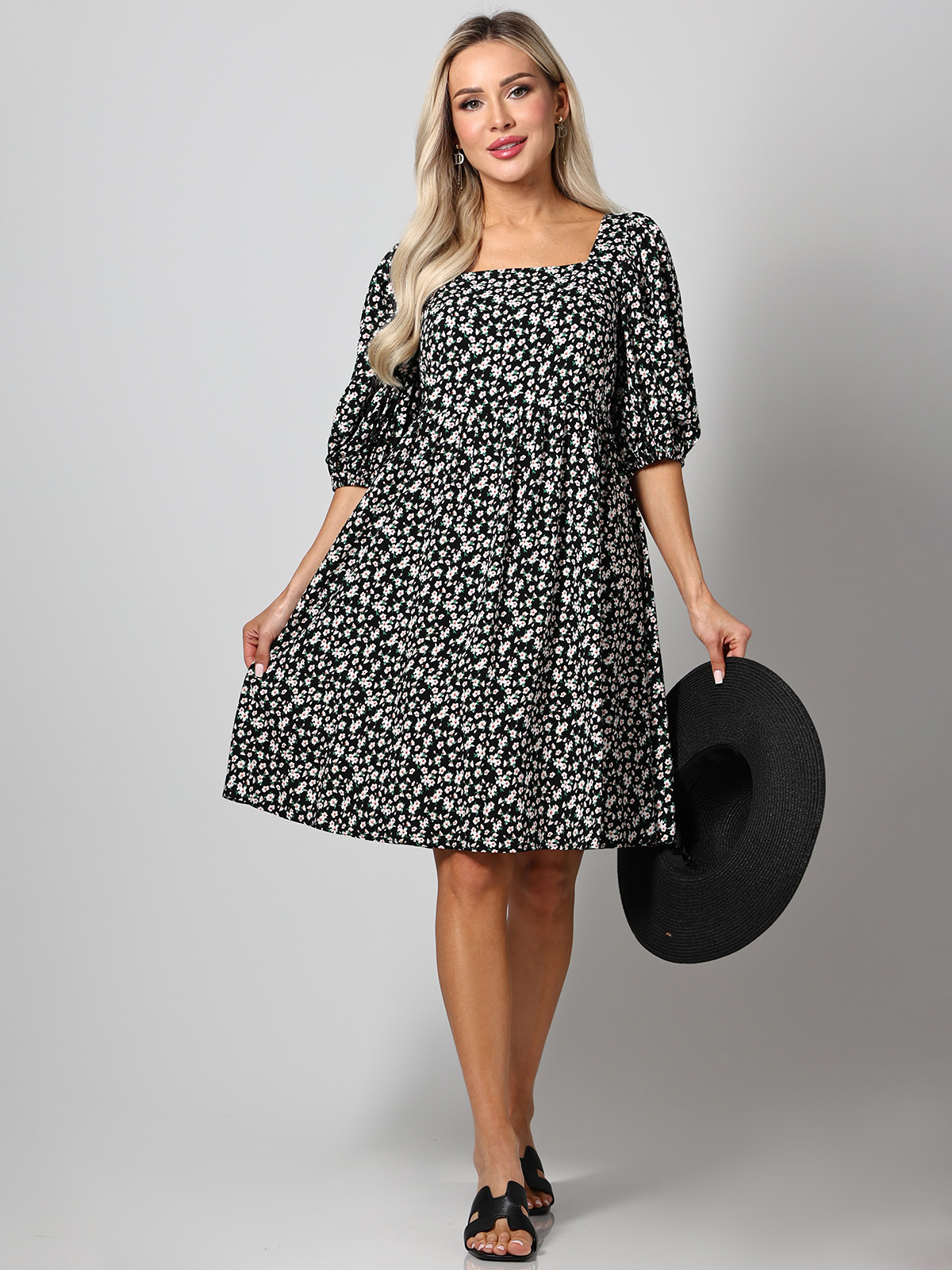 Платье с расклешенной юбкой идеально подходит для летнего сезона. Изготовленное из легкой и дышащей вискозной ткани, оно обеспечивает комфорт в жаркую погоду. Платье украшено нежным принтом в виде цветочков, который придает ему романтичный и женственный вид. Модель имеет кареобразный вырез горловины, который акцентирует внимание на декольте и ключицах, создавая утонченный и элегантный образ. Рукава-фонарики добавляют платью объем и воздушность, подчеркивая легкость и непринужденность стиля. Платье выполнено в А-силуэте, что позволяет ему мягко облегать верхнюю часть тела и расклешиваться к низу, создавая красивую и свободную линию. Завязки на спине обеспечивают удобную посадку и возможность регулировать плотность прилегания, добавляя изделию функциональности и изящности. Такое платье легко станет центральным элементом летнего гардероба, подходя для прогулок, встреч с друзьями или романтических свиданий. Для поддержания первоначального вида и мягкости ткани рекомендуется бережная стирка при температуре не выше 30 градусов.