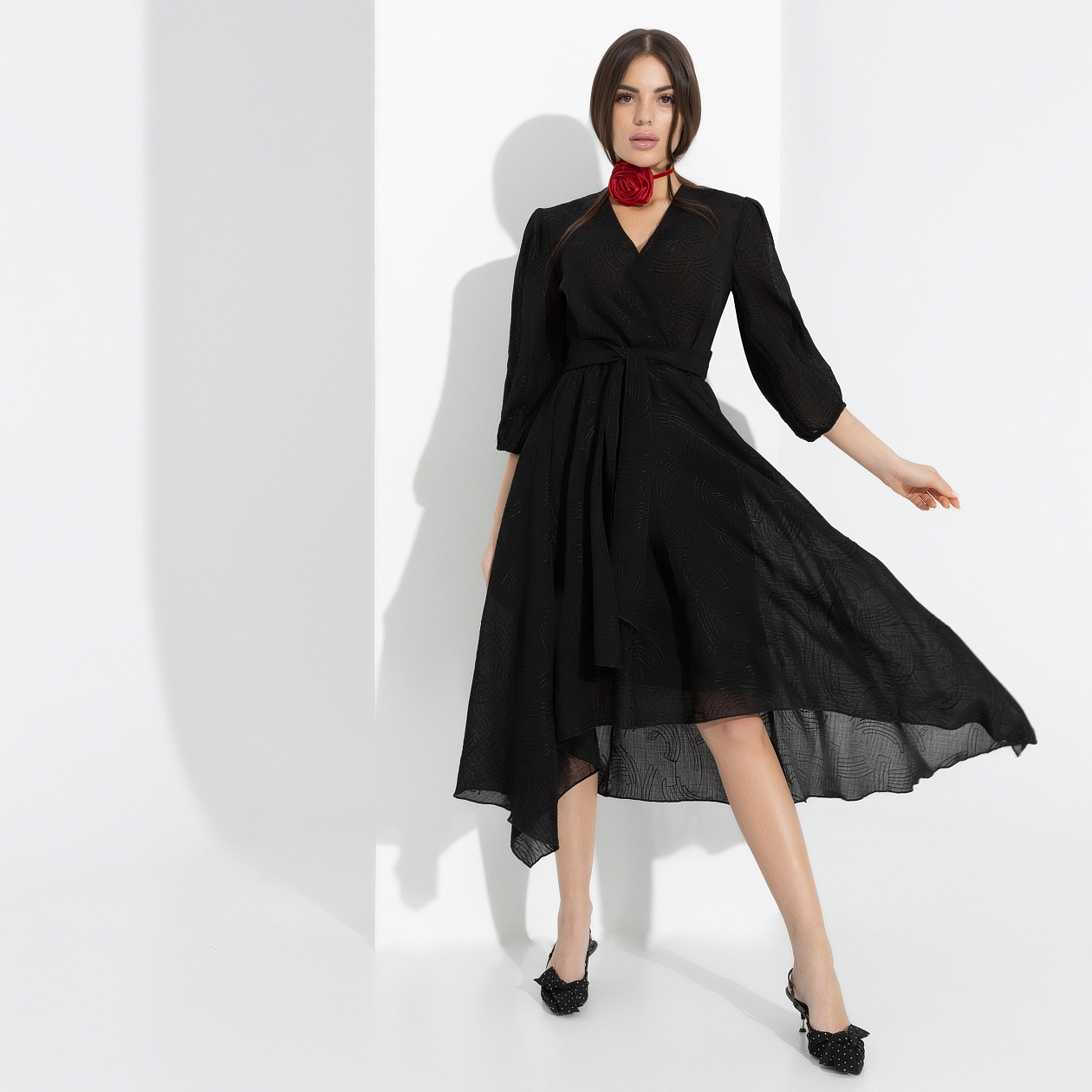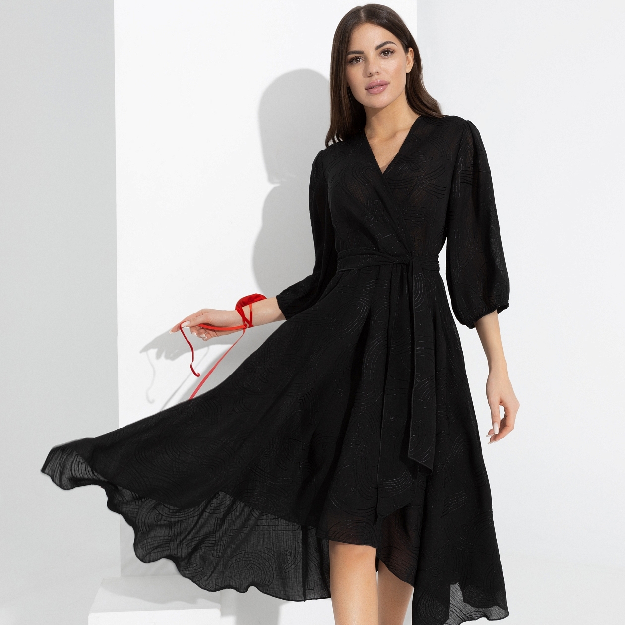 Летящий силуэт с асимметричным краем. Новое прочтение образов с последнего показа Versace. Пояс акцентирует талию, свободные рукава добавляют воздуха в образ. И не забываем про правильную линию декольте. Идеал!