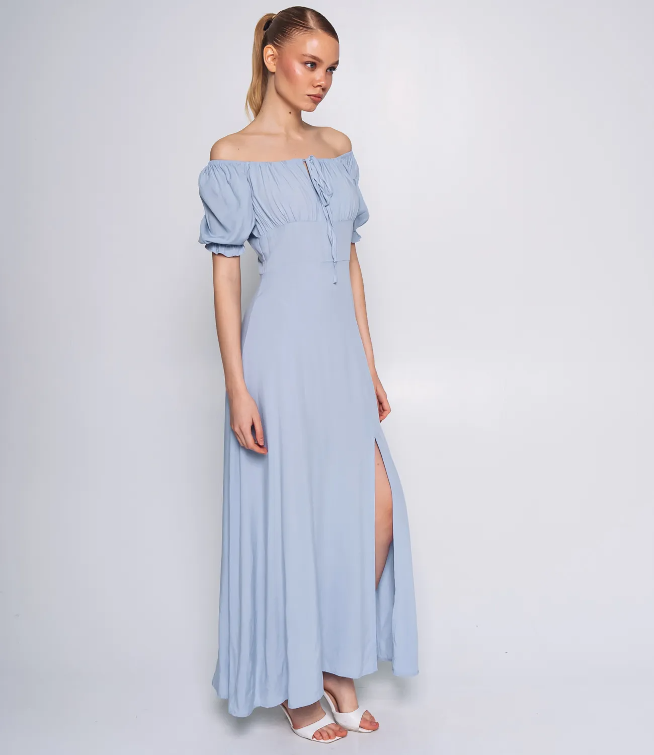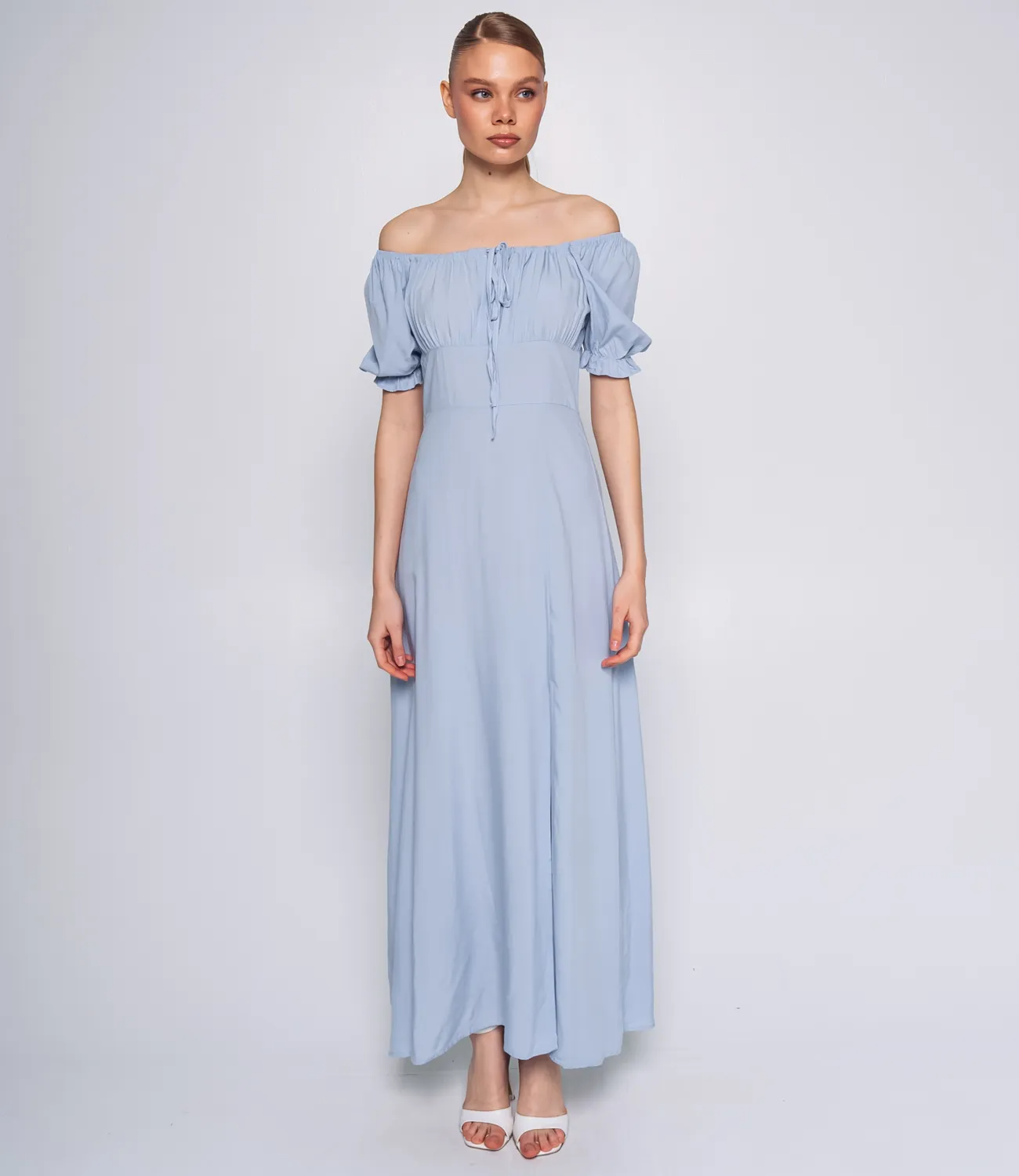 Платье представляет собой изысканную модель в пол с приталенным кроем, выполненным из легкого и дышащего материала, состоящего на 70% из вискозы и 30% из полиэстера. Это идеальное сочетание гарантирует комфортный микроклимат даже в самые жаркие дни. Округлый вырез с затяжкой спереди позволяет регулировать посадку по линии груди, что делает его подходящим для разных типов фигур. Рукава оформлены расклешенными рюшами, что придает образу игривость и легкость. Линия талии подчеркивается, а юбка струится вниз с высоким разрезом спереди, обеспечивая свободу движения и открывая возможность создания стильных образов. Это платье идеально подойдет для летнего гардероба и различных мероприятий, сочетая элегантность и комфорт в одном флаконе. Обратите внимание на насыщенный цвет и фактуру материала, которые полностью соответствуют представленным фотографиям на сайте. Мы понимаем, как важно обеспечить точный выбор размера, поэтому на странице нашего сайта размещена таблица размеров. Воспользовавшись ею, ваши покупательницы смогут без труда обмерить себя и найти идеальный вариант. Предложенная цена на это платье является доступной для оптовых покупателей, что делает его отличным предложением для вашего бизнеса. Подарите своим клиенткам возможность быть стильными и элегантными в этом потрясающем платье, которое прекрасно подчеркнет их индивидуальность и сделает любой образ незабываемым! Рост модели 173, 84-58-89.