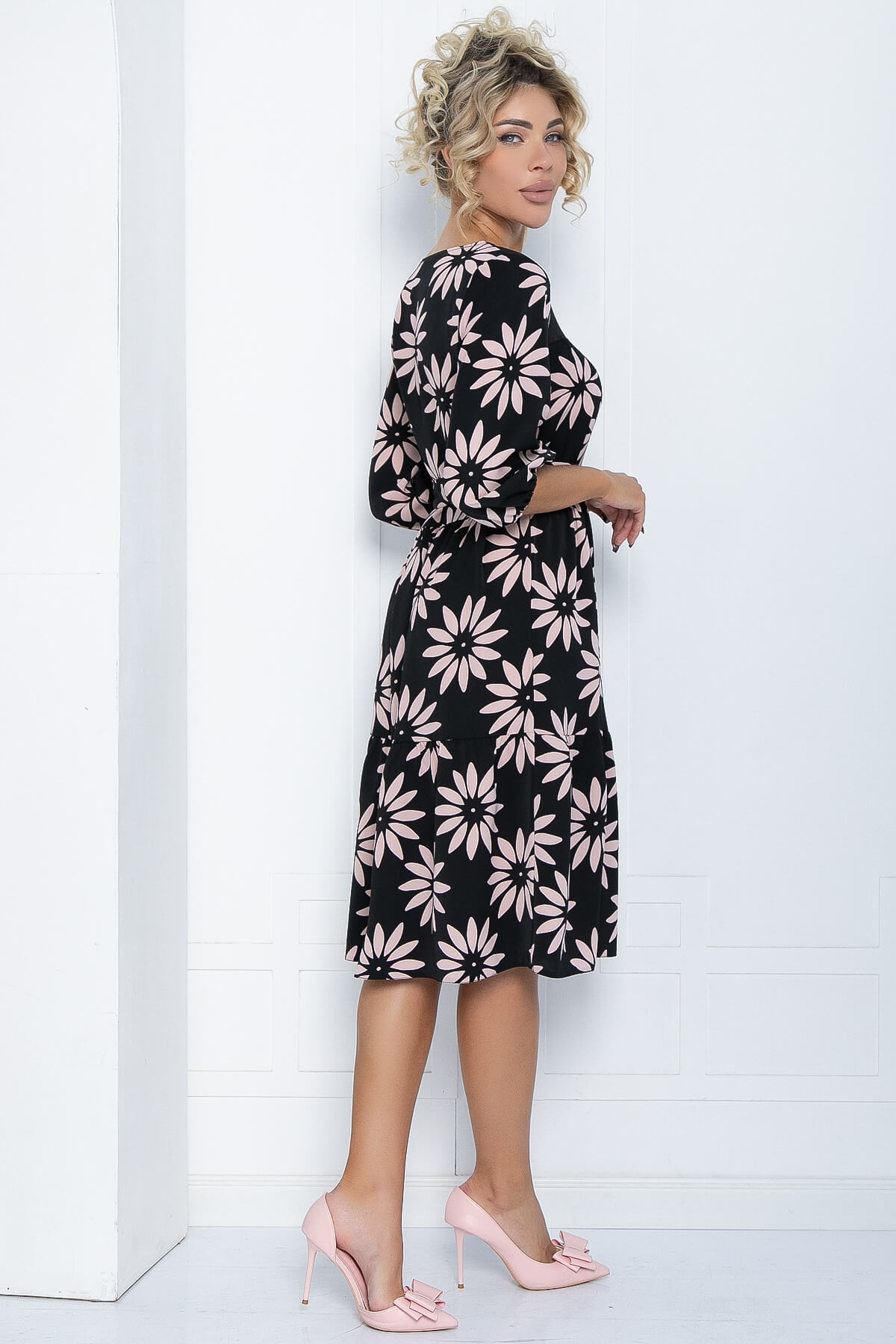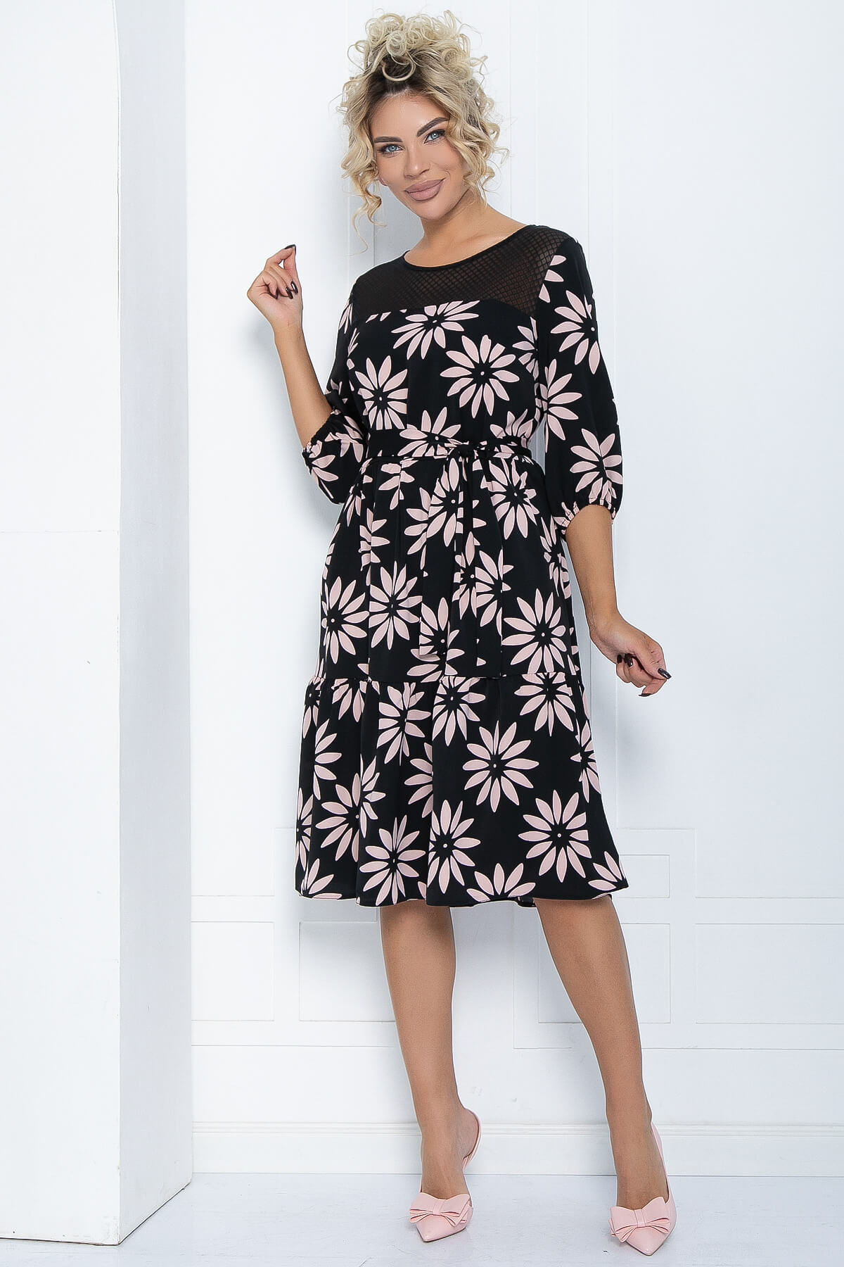 Платье свободного кроя, которое сочетает в себе воздушную лёгкость и элегантность. Верхнюю часть платья украшает вставка из кружева. Юбка состоит из широких воланов. В комплект входит пояс из основной ткани.